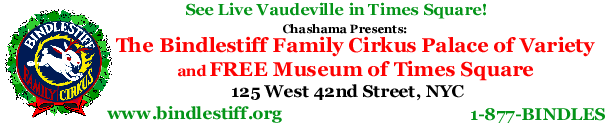 Bindlestiff Family Cirkus E-Mail Newsletter: In This Edition: . "High Heels & Red Noses Debuts in Times Square! . Palace of Variety and FREE Museum of Times Square Opens! . Volunteer and be a part of Times Square History . See Live Burlesque Stars at "Lucky Stiff" at the Pussy Cat Lounge! High Heels & Red Noses to Debut in Times Square this Friday at 8:00 PM What happens when a couple of ex Ringling Brothers and Barnum and Baily Circus Clowns join up with the sexiest show in town. See The Bindlestiff Family Cirkus' newest production High Heels & Red Noses in the greatest vaudeville show palace in New York City. The Bindlestiff Family Cirkus presents its latest innovative burlesque and circus theatrical extravaganza, "High Heels & Red Noses." Outrageous antics ensue when Kinko the clown finds a mysterious high heeled shoe in the trash. The unexpected arrival of its owner conjures a world of thrills, where surprises literally come out of the woodwork. Loaded with Bindlestiff's trademark burlesque humor and jaw-dropping theatrics, "High Heels & Red Noses" is a spectacular peek into the spine tingling world created in the Palace of Variety. For more information and to purchase tickets, visit the online ticket booth. This weekend we are giving a $5.00 discount to anyone who comes to a show either dressed as Santa Clause or a Clown, or mention "Longacre" when buying your tickets! See High Heels & Red Noses Every Friday, Saturday at 8:00 pm, Saturdays at 7:00pm. FREE Museum of Times Square Reopens With New and Bizarre Exhibits Did you know that Times Square was once a Cabbage Patch? Or that in got it's name from a Newspaper? Or that we have the only two headed chicken and four legged ducks in New York City? Be sure to visit the FREE Museum of Times Square to celebrate the centennial of the brightest, bawdiest and most outrageous place in America! The Palace of Variety and FREE Museum of Times Square is located at 124 West 42nd Street. Visit us online at www.bindlestiff.org. Bindlestiff Family Cirkus Winter Cabaret See our weekly display of Vaudevillian Variety and Audacious Amusements. These shows will feature the best of the "New Vaudevillians" and the most original and shocking rising stars. This weekends opening weekend lineup includes Mistress Philomena, Mr. Pennygaff, Laura Witwer-aerial, Drew the Fool, Angelo Iodice and Ula the Pain Proof Rubber Girl-aerial. Not to be missed entertainment presented in the intimate confines of the Palace of variety! See this show every Friday and Saturday at 11 pm. Dec 12 through Feb 29. No show Dec 26. Tickets: $15, Available at the box office or online. Volunteers and Staff Needed for Palace of Variety Be part of the most unique theatrical experience in New York City! Volunteers/Interns/Staff Members are needed at the Palace of Variety and FREE Museum of Times Square starting December first, when BFC moves back onto 42nd Street. We needed to help to promote, clean, tech and staff the Palace and Museum. Most positions are volunteer, though some do include some pay. Let us know if you can help out and gain a once in a lifetime experience! Contact our volunteer coordinator at cirkus@bindlestiff.org. Contact us at cirkus@bindlestiff.org and be sure to include a phone number and a good time to contact you. Also at the Palace of Variety: See these upcoming shows at the Palace of Variety. For a full schedule, go to our website. Broadway Man by Marc Leland December 17 and 18 at 8 pm "Broadway Man" is the Super Hero of the Great White Way. He defends women, children, and the American Musical. When he sings, criminals don't stand a chance. Never before has the world seen such a unique hero. This 30 minute, one act musical farce is filled with everyone's favorite Broadway songs. When Broadway Man's nemesis, "T.V. Tuneman," arrives, you'll be carried back to the good old days of television by a wave of T.V.'s most memorable theme songs. Put it all together and you have a theatrical experience that is guaranteed to make you laugh, sing and return with your friends to re-experience the fabulous time you had seeing "Broadway Man." Winnie's Wondercabinet December 17, 18, 19, 20 and 21 at 4 pm Tickets: $10 Finding herself in a musty Cabinet of Curiosities, Winnie is reacquainted with the impulse to wonder. Virtrines featuring tightwire, comedy, song, unicycle, shadow puppets and juggling, guide Winnie to realizations for which she has been searching. Lucky Stiff Still Hot at the Pussycat Lounge Tired of the "New" New York? In the depths of downtown NYC, only two blocks from the WTC Train Station, the exotic cabaret has risen again like the Phoenix. The Bindlestiff Family Cirkus and the Lucky Devil Circus Side Show have teamed p to make your circus fantasies come true. Lucky Stiff will suck you into a netherworld where you will be seduced by clowns and sword swallowing burlesque stars. Plus your chance to win a strip club super prize pack! Hosted, as always, by Tyler Fyre and Keith Bindlestiff. What: "Lucky Stiff in the Pussycat" Show When: Every Wednesday Through November Where: Pussycat Lounge, 96 Greenwich Street, NYC Showtime: 9:00 pm Admission: $11, ADULTS ONLY! ( Get in Cheap - print this email and get in for just $8! ) Information: (212) 726-1935 N, R, 1, & 9 Subway to Rector Street "Lucky Stiff" Is a Bindlestiff Family Cirkus and Lucky Devil Circus Sideshow Production THIS IS NOT INTENTIONAL SPAM! TO UNSUBSCRIBE FROM THIS LIST, E-Mail bindles@myway.com with the words "remove me" in the subject line.