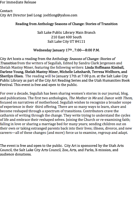 ForImmediate Release Contact: City Art Director Joel Long: joeltlong@yahoo.com Reading fromAnthology Seasons of Change: Stories of Transition Salt Lake Public Library Main Branch 210 East 400 South Salt Lake City UT 84111 WednesdayJanuary 17th , 7:00—8:00 P.M. CityArt hosts a reading from the Anthology Seasons of Change: Storiesof Transition from the writers of Segullah, Edited bySandra Clark Jergensen and Shelah Mastny Miner, featuring the followingwriters: Linda HoffmannKimball, Darlene Young, Shelah Mastny Miner,Michelle Lehnhardt,Terresa Wellborn,and SherilynOlsen. The reading will be January 17th at 7:00 p.m.at the Salt Lake City Public Library as part of the City Art Reading Series andthe Utah Humanities Book Festival. This event is free and open to the public. Forover a decade, Segullah has been sharing women’s stories in our journal, blog,and publications. The first two anthologies, The Mother in Me and Dancewith Them, focused on narratives of motherhood. Segullah wishes torecognize a broader scope of experience in their third offering. There are so many ways tolearn, share and become reshaped through a spectrum of transitions.Contributors crave the catharsis of writing through the change. They writetrying to understand the cycles of life and embrace their reshaped selves. Joiningthe Church or re-examining faith; falling in love or sharing a marriage bed formany years; sending children out on their own or taking estranged parents backinto their lives; illness, divorce, and new careers—all of these changes (andmore) force us to examine, regroup and adapt. Theevent is free and open to the public. City Art is sponsored by the Utah Arts Council, the Salt Lake City ArtsCouncil, Zoo, Arts, and Parks, X-mission, and audience donations. Joel Long