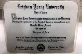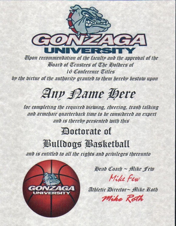 HB Arnett's "Lite" <mailto:hbarnett@fiber.net> hbarnett@fiber.net 801 372 0819 Vol. 38, Issue 28, - February 4, 2019 Yes and No Answers to Gonzaga's 93-63 Thrashing of BYU Yes, Gonzaga is really that good! Yes, The Zags have 4 and possibly 5 legitimate NBA prospects on their roster. No, BYU has zero NBA prospects on its current roster. (They may have a couple of Euro prospects in Childs and Haws and it's still too early to tell with Baxter, but he is trending up. Yes, The coaching apples don't fall far from the Dave Rose tree. Quincy Lewis played for Rose at Dixie JC. Lee Cummard played for Dave Rose at BYU. Tim Lacomb didn't play for anybody. Here is the offical BYU resume of Lewis, Lacomb and Cummard. Tim Lacomb - Coaching Experience * BYU Assistant Head Coach (2017-present) * BYU Associate Head Coach (2015-17) * BYU Assistant Coach (2010-15) * BYU Director of Operations (2007-10) * Utah Video Coordinator (2005-07) * American Fork Assistant Coach (2002-05) * Lone Peak Assistant Coach (1999-02) * Utah Team Manager (1994-96) Quincy Lewis - Coaching Experience * BYU Assistant Coach (2015-present) * Lone Peak High School Head Coach (2003-15) * Southern Utah Assistant Coach (2002-03) * Utah Valley State College Assistant Coach (1997-02) * BYU-Hawaii Assistant Coach (1995-97) Lee Cummard - Coaching Experience * BYU Assistant Coach (2018-present) * BYU Graduate Assistant (2016-2018) Yes, the coaching apples also don't fall far from Gonzaga's Mark Few's tree. Donnie Daniels - Coaching Experience * Gonzaga Assistant Coach (2010 - 2019) * UCLA Assistant Coach (2004 - 2009 * Cal State Fullerton Head Coach (2001-2003) * Utah Assistant Coach (1990-2010) Tommy Lloyd - Coaching Experience * Gonzaga Assistant Coach (2001-2019) Responsible for Foreign Recruiting * Gonzaga Administrative Assistant (1999-2000) Brian Michaelson - Coaching Experience * Gonzaga Assistant Coach 2013-2019) * Assistant director of basketball operations (2010-2012) * Gonzaga administrative assistant (2008-2009) * Walk-on for Mark Few at Gonzaga (2001-2002) So, what's the difference between the coaching staffs at BYU and Gonzaga and the superior success of the Zags over the Cougars and the rest of the WCC? This guy - His name is Tommy Lloyd Click Here <https://gozags.com/coaches.aspx?rc=252&path=mbball> to see what he has done for Gonzaga. Sheepish of Sheepskin? Ask any Gonzaga graduate or current student if they think their degree is diminished or tarnished by their school admitting 4-5 foreign students with limited English proficiency annually to play basketball. How do you think they would respond? How would you respond? Ask any BYU graduate or current student if they think their degree is diminished or tarnished if their school admits 2-3 foreign students annually to play basketball? How do you think they would respond? How would you respond? Since I have a degree from BYU as evidenced by the above photo, let me respond personally. I would gladly give up 3-10% of my BYU birthright and diploma bragging rights for an annual berth in the NCAA tournament. What's a little mess of pottage on my part to clean up the current messes of recruiting for BYU football and basketball. Here is Gonzaga's diplomatic diploma response below. Here's my personal response. I will gladly take a 5% depreciation on my BYU degree if the Cougars can beat Utah, Tennessee, USC, Washington and Boise State in football and can at least split with Gonzaga. And I don't care if they do it with little to no English grammar skills as long as they have "game". The only other alternative for BYU in basketball is this: Refuse to play Gonzaga and plead and play the xenophobia card. BYU 67 LMU 49 It Was Baxter to the Maxter Take it to the max is an expression of achievement. Try this on for achievement in your first start as a BYU basketball player. I'm referring of course to Gavin Baxter's line in BYU's 67-49 win over LMU last Saturday night in Provo. Granted, they are only numbers, but are numbers that are usually reserved for Yoeli Childs and TJ Haws. What does it mean? Baxter can play.at least against LMU in his first career start. Nick Emery used to know how to play and then he forgot after a two-year layoff. The temporary bout of amnesia is apparently gone based on Emery's stats against LMU. All box scores are not equated equal. For that reason, don't go looking at the BYU boxes with Gonzaga, Mississippi State and San Francisco. The BYU women also had a couple of box bummers this last week on the road as they lost to both LMU and Pepperdine. Here are the current WCC standings for men and women. Television Timetable BYU vs. Portland (M Basketball) Thursday February 7 at Portland Tipoff: 9:00 pm MST TV: ESPN2 BYU vs. Pacific (M Basketball) Saturday, February 9 at Provo Tipoff: 7:00 pm MST TV: BYUtv BYU vs. Saint Mary's (W Basketball) Thursday, February 7 at Provo Tipoff: 11:00 am MST TV: BYUtv BYU vs. Pacific (W Basketball) Saturday, February 9 at Provo Tipoff: 2:00 pm MST TV: BYUtv I'll be back later tonight, but probably tomorrow, with some previews of national letter-of-intent day for football.