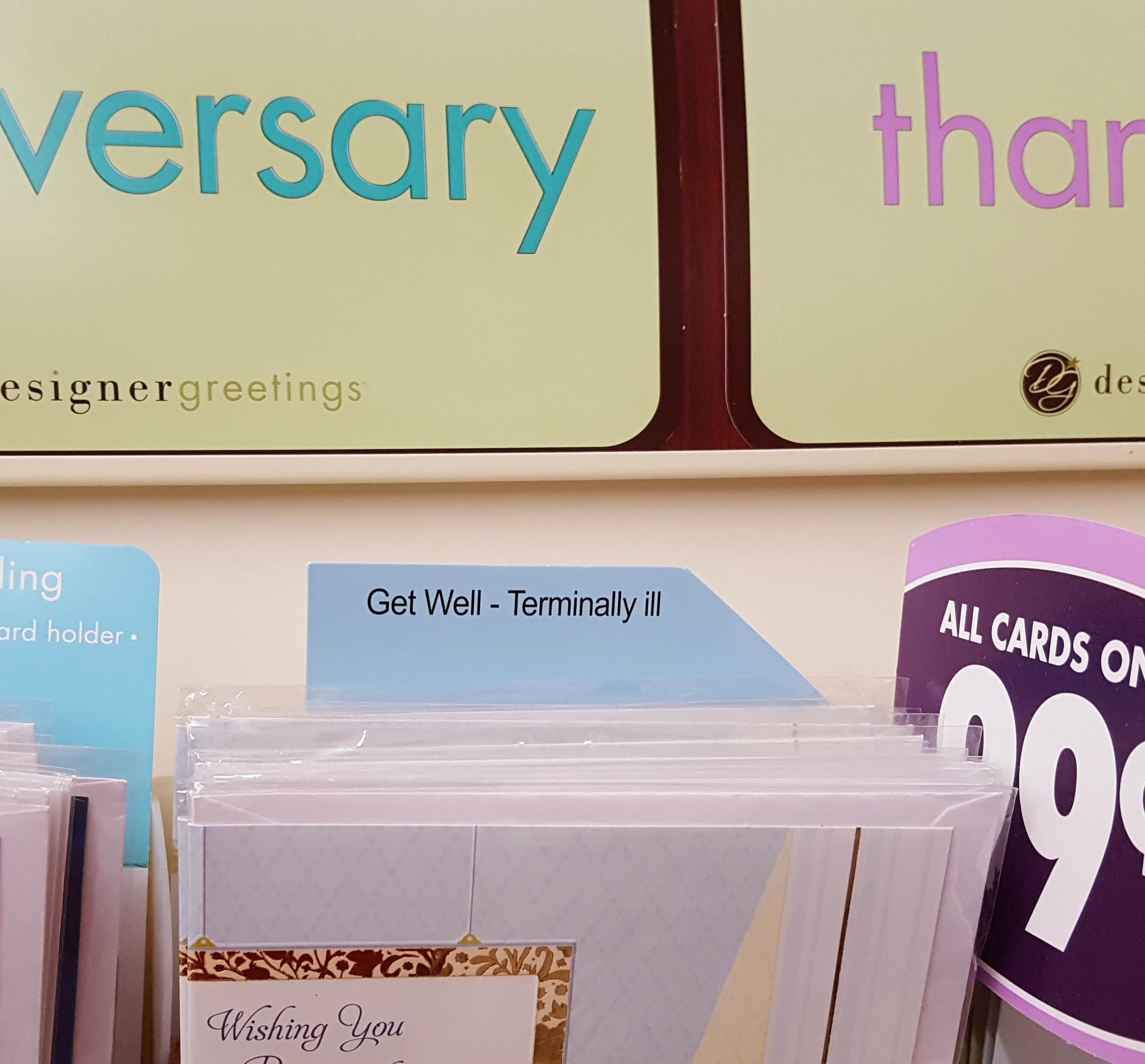Blaine, thank you!!! When I call dad doesn't want to talk much and mom isn't very forthright "I'm fine" isn't very informative. Sounds like famous last words, engraving on a tombstone or heading for an obituary! So, yes, information is good. Reminds me of this card section Joe snapped a picture of... On Sunday, September 25, 2016, Blaine Gardner <blaineg@gmail.com> wrote: