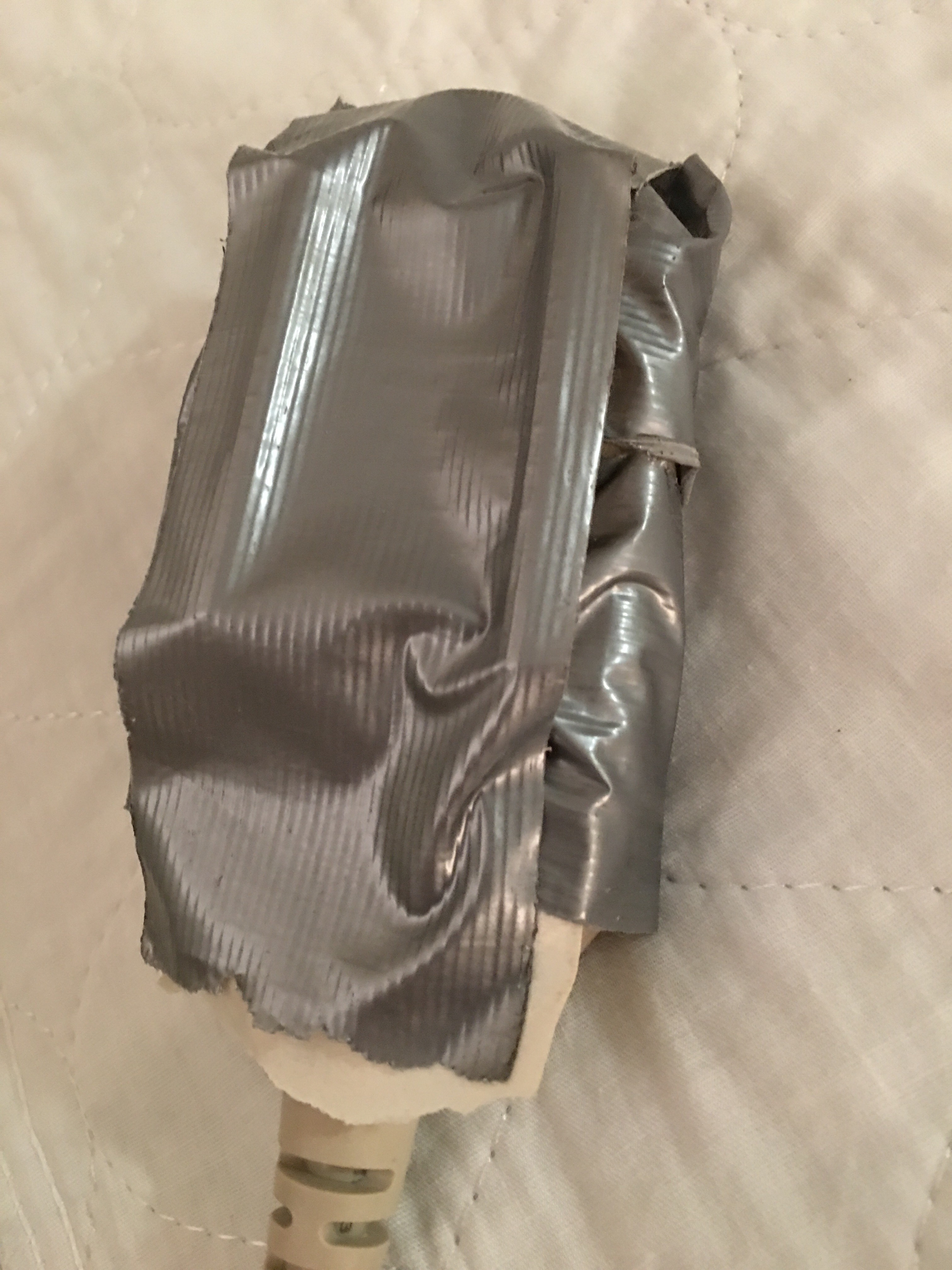 Then Val & I worked through several iterations of remote control improvements, because Dad found the buttons confusing. We tried colors and diagrams, and wound up with dowels and duct tape. It looks pretty strange, but does what he wants. Horizontal dowels act as toggle switches for up and down. Vertical dowels let him move both ends of the bed together. He's still inventing!