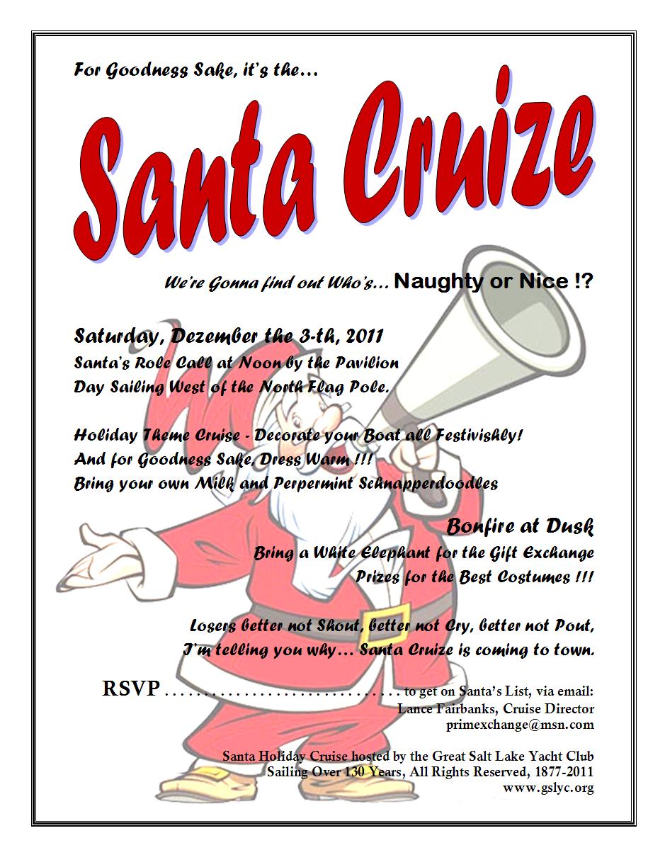 For Goodness Sake's... its the Santa Cruize - Hosted by GSLYC Saturday December 3rd Noon to Dusk Daysail - Bonfire - Prizes - Gifts Please see the attached Flyer for Details PLEASE RSVP - QUESTIONS? primexchange@msn.com Lance Fairbanks, Cruising Director Great Salt Lake Yacht Club