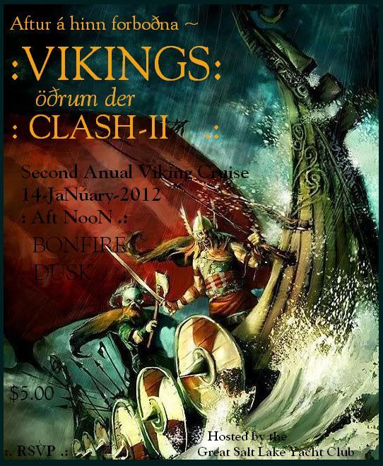 Return of the Forbidden :. CLASH OF THE VIKINGS .:Second Annual Viking Cruise.: Saturday, January 14, 2012 :. Meeting at 12~NoonBonfire at Dusk yfirgefa sverð Viking Attire EncouragedPrizes to be Awarded $5.00 Donation per Person PLEASE - RSVP Lance Fairbanksprimexchange@msn.com :. Weather Permitting .: Hosted by the Great Salt Lake Yacht Club,1877-2012All Rights Reserved (C) Sailing for 135 Years