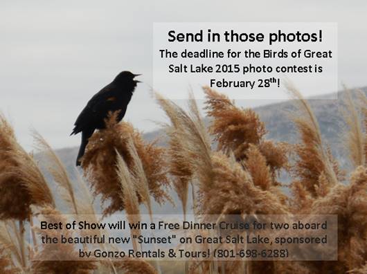 Enter your GSL Bird Photos within the next week and get a discount to the Rocky Mountain School of Photography's Photo Weekend, a two-day photography workshop taking place in Salt Lake City on February 7th and 8th! Details about Rocky Mountain School of Photography's Photo Weekend can be found here: https://www.rmsp.com/weekends/2015-salt-lake-city-utah/#tab-description. Entry forms and Birds of GSL 2015 contest details can be found here: http://stateparks.utah.gov/park/great-salt-lake-state-park/events/birds-grea t-salt-lake-2015-photo-contest Dave Shearer Harbor Master Great Salt Lake State Marina Antelope Island State Marina 801-209-9142