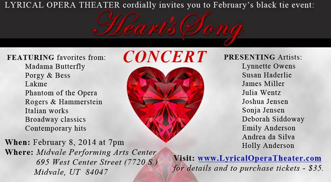 From: lynnetteowens@comcast.net Hello Friends and Family! Here is just a reminder for those of you that want to attend our “Heart’s Song” concert to get your tickets soon. The Midvale Performing Arts Center is a small venue and many of the tickets are already sold. Simply go to www.LyricalOperaTheater.com under the “Tickets” tab to buy them. Thank you! – Lynnette Owens Concert Invitation: Thank you! Lyrical Opera Theater