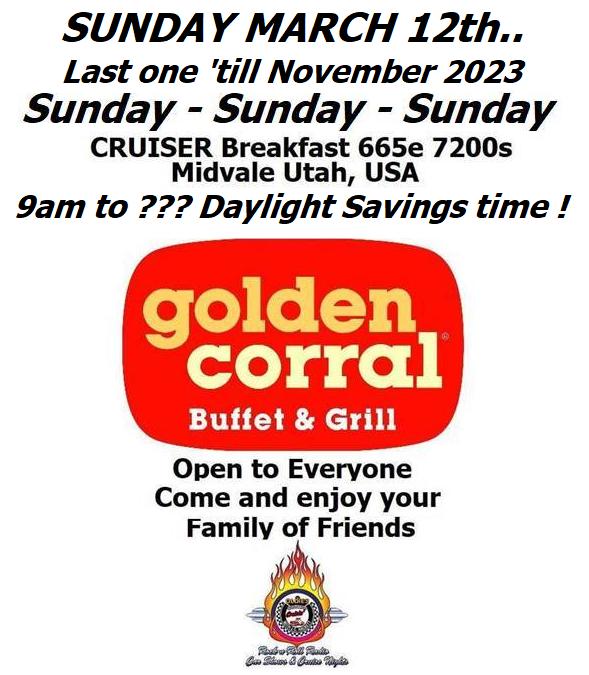 HELLO EVERYONE! Don't know about you, but I am SO READY to get out and back to our events! Sunday March 12th is our last Cruiser Breakfast 'till next November. Come and join us.. Don't forget to re-set your clocks for Daylight "Savings Time" 9am is still 9am! EVERYONE IS WELCOME As per "FOREVER" our Breakfast are open to everyone, Tell a friend, BRING a friend. Please remember,, our servers work hard for us, Tips are greatly appreciated. Sad but true, we have lost so many of our "Family of Friends" over the Winter Break. Let's get back to seeing, and having fun again, Be Nice, Bring a SMILE, Share a SMILE. Time is so short, and not promised, Enjoy each and every person, every minute, EVERY SINGLE DAY! See you... Somewhere !!! Jc MORE 2023 Scheduled Events.. 12 MAR, SUN 9p-11am CRUISER BREAKFAST Golden Corral 665e 7200s 17 MAR, FRI 2p-9p Pocatello, Chrome in the Dome, Car Show ISU Holt arena, 550 Memorial Dr. (St. Patrick's Day) **Special Guests Ed & Wendy Jones** 18 MAR, SAT 9a-7p Pocatello, Chrome in the Dome, Car Show ISU Holt arena, 550 Memorial Dr. 18 March 11-4p GRANTSVILLE Social Car Show 155e Cherry St 435-850-5580 Charlie Strickland 25 MAR, SAT 9a-3p Washington, March Mayhem Car Show, Crimson Cliffs High School, 435-623-2617 4430s Crimson Cliffs Way 25 MAR SAT 5-8p St. George Larson's FROSTOP FREE Cruise Night 858e St George Blvd. 435-623-2617 435-673-2216 31 MAR Friday 5-7p BEAVER CITY CARQUEST 85n Main St 435-438-2347 1 APRIL 9-11a ST. GEORGE CARQUEST Cars & Coffee Car Show 920n 2100w 435-522-3042 4 APR, TUE 5-8p LEHI ONE MAN BAND Free Cruise Night 1220e Main Street Exit 279 5 APR, WED 5-8p JORDAN LANDING FREE CRUISE NIGHT 3751w 7273s s Plaza Center Drive, By Famous Dave's 801-450-4494 9 APR, SUN Easter Sunday 14 APRIL 5-7p CEDAR CITY CARQUEST FREE CAR SHOW 377n 2150w 435-586-3834 15 APR, SAT 9a 3p St. George, HAVOC Car Show, Washington City Elem. School. 435-623-2617 420n 200w, Washington Utah 15 APR SAT 5-8p St. George Larson's FROSTOP FREE Cruise Night 858e St George Blvd. 435-623-2617 435-673-2216 19 APR, WED 5-8p Murray, SHAKE SHACK Free Cruise Night, 6123s State ST, 801-448-7907 20 APR, THU 5-8 NO APRIL EVENT Live DayBreak (SoDa Row) FREE Cruise Night /Car Show, 22 APR, SAT 9a 3p Timpanogos Harley Car-Truck-Bike Show, Linden Ut 555s Geneva Rd. 25 APR, TUE GARAGE GRILL, Draper 1122e Draper Parkway (12300s) 26 APR, WED 5-8p Layton BURGERSTOP Free Cruise Night, 5/8 323e Gentile St 801-544-8090 27 APR, THU 5-8p West Valley City, Valley Fair Mall FREE Cruise Night, 3662s 2400w (East Side by Springhill Suites) 28 APR, FRI 4-7p MOAB Free CARQUEST Cruise Night, 1010s Main St. 435-259-2413 29 APR, SAT 9a 3p MOAB Car Show, Swanny Park, Moab Utah 100w 400n 435-260-1948 2 MAY 5-7 LEHI One Man Band FREE Cruise Night 1220e Main St 801-766-0552 3 MAY 5-7p West Jordan Jordan Landing FREE Cruise Night 3751w 70th South 5 MAY 3-7p PAGE ARIZONA Welcome/Registration Cruise Night PARTY 665s Lake Powell Blvd. 928-691-0042 5 MAY 8-3p PAGE ARIZONA CAR SHOW Page City Park 600n Navajo St 928-691-0042 10 MAY 5-7P WEST VALLEY CITY HIRES FREE CRUISE NIGHT 2900W 4700S 801-965-1010 13 MAY 8-3P Heber City CARQUEST FREE CAR SHOW 434n Main St 435-654-1520 CHECK OUR WEBSITE FOR MORE 2023 EVENTS <http://WWW.jchackett.com> WWW.jchackett.com J.C Hackett Oldies "Rock & Roll Radio" Productions Real Oldies, KCPX Salt Lake City, Utah 84127 <http://www.jchackett.com/> www.jchackett.com Email <mailto:jc@jchackett.com> jc@jchackett.com