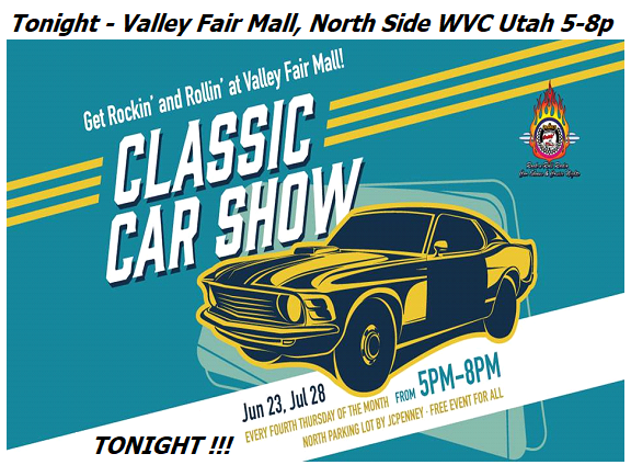 Tonight Drop by and join in 3600s 2700w, FREE Valley Fair Mall Cruise Night One of the longest running FREE Cruise Nights LAST CHANCE TO PRE-REGISTER FOR SATURDAY IN HEBER ***** Future Events 23 JUN, THU Valley Fair Mall, FREE Cruise night 3601s 2700w 5/8p 24 JUN, FRI Heber Welcome Party 25 JUN, SAT 8/3:25pm Heber Back to the 50's Car Show 250s Main St Heber City Park, Heber City Utah 801-597-3133 26 JUN, SUN Cancelled All Mopar Show 10909s Automall Dr 9a/3p 801-513-4538 Josh 27-28-29-30 JUN, V A C A T I O N 30 JUN, THU Cache Valley 1 JUL, FRI Cache Valley 2 JUL, SAT Cache Valley 4 JUL, MON Independence Day GRANTSVILLE FREE CAR SHOW 5 JUL, TUE LEHI ONE MAN BAND Free Cruise Night 1220e Main Street Exit 279 801-766-0553 6 JUL, WED 5-8p JORDAN LANDING FREE CRUISE NIGHT 3751w 7273s s Plaza Center Drive By Famous Dave's 801-450-4494 7 JULY Thursday SAMS CLUB FREE Fundraiser Car Show 11248s Draper Parkway 9 JUL, SAT Copperton Angels Hands Car Show, 9-3, 8690w 10305s, 801-201-5164 11 JUL, MON Legends FREE Cruise Night, LEHI Ut. 5-8p 3661 Outlet Parkway Dr. 385-352-8194 12 JUL, TUE Herriman Garage Grill, FREE Cruise Night 4874w 12600s 5/8 13 JUL, WED 5-8p Springville, LEGENDS FREE CRUISE NIGHT, 1715w 500s 801-489-0889 14 JUL, THU CANCELLED -- GODFATHERS 16 JUL, SAT 9-3p Draper Days FREE Car Show Draper City Park, 12500s 1300e 801-209-9231 Doug 20 JUL, WED Shake Shack, FREE Cruise Night 6123s State St, 801-448-7907 21 JUL, THU 5-8p Live Day Break SoDa Row FREE Cruise Night 11248 kestrel rise rd. 23 JUL, SAT Kamas Kar Show JUNKIE Car Show Kamas City Park, 26 JUL, TUE Garage Grill, Location Pending 27 JUL, WED Layton Burger Stop FREE Cruise Night, 323e Gentile Rd. Layton 28 JUL, THU Valley Fair Mall FREE CRUISE NIGHT, 3601s 2700w 5/8p 29 JUL, FRI Wells Fun Run, 30th Annual, Car-Truck-Motorcycle Show 775-752-1153 30 JUL, SAT Wells Fun Run, 30th Annual, Car-Truck-Motorcycle Show 775-752-1153 31 JUL, SUN Wells Fun Run, 30th Annual, Car-Truck-Motorcycle Show 775-752-1153 2 AUG, TUE LEHI ONE MAN BAND Free Cruise Night 1220e Main Street Exit 279 801-766-0553 3 AUG, WED JORDAN LANDING FREE CRUISE NIGHT 3751w 7273s s Plaza Center Drive By Famous Dave's 801-450-4494 5 AUG, FRI 5pm Evanston Welcome "Pot Luck" Party Hamblin Park Bowery 6 AUG, SAT Evanston 27th Annual Car Show, Hamblin Park, 203 Bear River Drive 9a-3p 8 AUG, MON Legends/Strap Tank FREE Cruise Night, 3661 Outlet Parkway Dr, Lehi 385-352-8194 **** Please do NOT "hit reply" to this email, **** It goes to a mailing service If you would like to email us,, our address is <mailto:jc@jchackett.com> jc@jchackett.com If you know of anyone who would like to receive "Cruise Event Related" information, Simply have them shoot us an email.. They will be added to our mailing list, As you see, it is "blind copied" so others will not get your address.. Please feel free to pass this along to your friends. A Most Important rule to follow.. BE NICE, Think of others, Give someone, ANYONE a SMILE.. You would be so surprised how it will make YOU feel! J.C Hackett Oldies "Rock & Roll Radio" Productions Real Oldies, KCPX Salt Lake City, Utah 84127 www.jchackett.com <http://www.jchackett.com/> Email jc@jchackett.com <mailto:jc@jchackett.com>