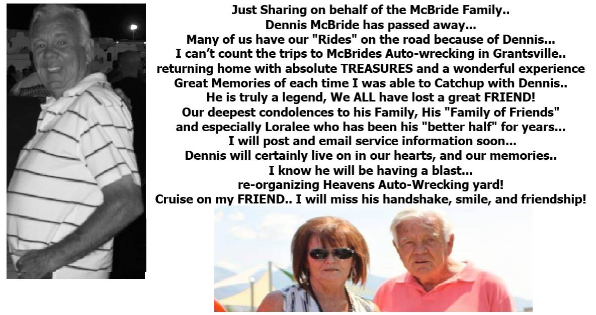 https://www.didericksenmemorial.com/obituaries/dennis-mcbride As per Dennis's Request, PLEASE bring your "Ride" as a classic farewell to such a really great Guy. Cruise on Dennis. you will be missed by all ! j.c Dennis Aaron McBride passed away peacefully at home with Loralee by his side on April 27, 2024, after a short battle with cancer. Dennis was born on June 10, 1944 to Aaron Edward McBride and Erma Wildon McBride. Dennis led a magnificent life. As a young child he would fly with the Edde brothers around Grantsville waving to his Mom and Dad from the airplane window. The Edde brothers owned and operated the only airport in Grantsville, which Dennis later would come to own. Like his Dad, Dennis had a love for classic cars and started collecting and restoring many over the years. Dennis worked for Tooele Army Depot and owned McBride Disposal for Tooele County and Wendover, and the infamous McBride Auto Wrecking in Grantsville. Dennis had been married twice in his life and between those marriages had 4 children: Niel, Shawn, Camille and Ryan. He has two sisters: Diane Vorwaller and Karen Taylor. Dennis started dating his life long friend Loralee Harris Garn in 2008 and they've been together ever since. He also gained a daughter (Angie Smith) son in-law (Dusty Smith) and grandson (Gage Smith). Dennis and Loralee loved to reminisce about the good ol' days, traveled many times to Puerto Vallarta, numerous car shows where great friends were made, and he loved taking his buddy Gage to car shows, the circus, the State Fair, and most importantly free popcorn Tuesdays at the movies. Dennis has had many, many friends over the years, but one in particular is Loren Sowle who started working for Dennis' dad Aaron at a young age. Dennis is preceded in death by his parents, a stepmother Doris Smith McBride, and many friends that all left too soon. He will be deeply missed by many. And as a friend said "legends never die." Funeral services will be held on Saturday, May 4th, 2024 at the church on <https://www.google.com/maps/search/428+South+Hale+Street?entry=gmail&source =g> 428 South Hale Street in Grantsville. Viewing will start at 10 a.m. with the funeral to follow. Interment will be at Grantsville City Cemetery.