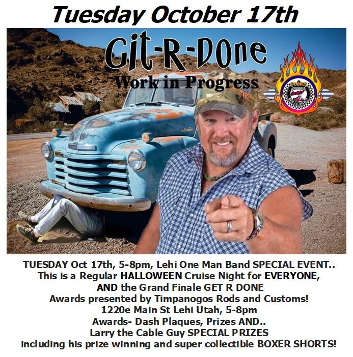 WEDNESDAY the 18th Shake Shack HALLOWEEN STYLE Cruise Night 6123s State St. Murray Utah, 5 to 8pm.. Thursday the 19th, SoDa Row in Daybreak HALLOWEEN STYLE Cruise Night, Co-Hosted by the Daybreak Motor Club, 11248 Kestral Rise Road, (11300s 4700w) 5 to 8pm Please check our website for More of our fun, And event information <http://www.jchackett.com/events> www.jchackett.com/events If you would like to email us,, our address is <mailto:jc@jchackett.com> jc@jchackett.com If you know of anyone who would like to receive "Cruise Event Related" information, Simply have them shoot us an email.. They will be added to our mailing list, As you see, it is "blind copied" so others will not get your address.. Please feel free to pass this along to your friends. A Most Important rule to follow.. BE NICE, Think of others, Give someone, ANYONE a SMILE.. You would be so surprised how it will make YOU feel! **** Please do NOT "hit reply" to this email, **** It goes to a mailing service ***** FUTURE EVENTS Oh Wait,,,, There are MORE .. FUTURE J.C Hackett Hosted EVENTS 17 OCT, TUE Lehi GET R DONE FINALE and HALLOWEEN STYLE CRUISE NIGHT Lehi One Man Band 1220e Main St. 18 OCT, WED HALLOWEEN STYLE Murray, SHAKE SHACK Free Cruise Night, 6123s State ST, 801-448-7907 19 OCT, THU HALLOWEEN STYLE Live DayBreak (SoDa Row) FREE Cruise Night /Car Show, 11248 Kestrel Rise Rd. (11300s-4700w) 24 OCT, TUE HALLOWEEN STYLE Garage Grill Draper.. FREE Cruise Night 1122e 12300s, Draper Utah 801-523-3339 25 OCT, WED HALLOWEEN STYLE Layton BURGERSTOP Free Cruise Night, 5/8 323e Gentile St 801-544-8090 26 OCT, THU Halloween Style West Valley City, Valley Fair Mall FREE Cruise Night, East Side by Springhill Suites.. 28 OCT, SAT Washington City, First Responders CAR SHOW, HALLOWEEN STYLE Washington Elem. School. 300n 300s 435-623-2617 31 OCT, TUE Tuesday, October 31 Halloween 4 NOVEMBER, SAT LAS VEGAS NEVADA 8-4p (Entry fee includes T-shirt) Goldstrom's Nostalgia Museum Annual Car-Truck-Bike Show 5375 Cameon St, Las Vegas Nevada USA 702-876-3652 J.C Hackett Oldies "Rock & Roll Radio" Productions Real Oldies, KCPX P.O Box 271226 Salt Lake City, Utah 84127 <http://www.jchackett.com> www.jchackett.com Email us at <mailto:jc@jchackett.com> jc@jchackett.com