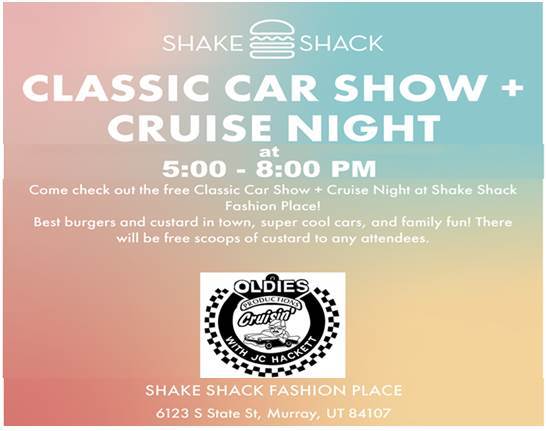 TONIGHT A FREE Cruise Night at Murray Shake Shack,. 6123s State Street (Fashion Place Mall, North/West Corner) Shake Shack events have had over 122 registered,, Come and join in a Fun Family Event, Awards, Dash Plaques, Prizes, and "Specialty Plaques*.. of course! .. We will be displaying in the North/West parking lot, Please pass along this event information and make plans to join us. oh, and COME HUNGRY.. You will be very glad you did! WEDNESDAY May 17TH 5-8PM COOL-Cool-Cool FRIENDS!!! FUTURE EVENTS .. 17 MAY, WED 5-8p Murray, SHAKE SHACK Free Cruise Night, 6123s State ST, 801-448-7907 18 MAY, THU 5-8p Live DayBreak (SoDa Row) FREE Cruise Night /Car Show, 11248 Kestrel Rise Rd. (11300s-4700w) 20 MAY, SAT UVU Car Show/Swapmeet/All Day, UVU Orem Parking lot, North/West area.. (Register Day Of Show) 21 MAY, SUN HARRISVILLE Jelsco Awards FREE Car Show, 1150 Highway 89 10/2 801-782-7574 23 MAY, TUE 5-8p PENDING - Draper Garage Grill 24 MAY, WED 5-8p Layton BURGERSTOP Free Cruise Night, 323e Gentile St 801-544-8090 25 MAY, THU 5-8p West Valley City, Valley Fair Mall FREE Cruise Night, East Side by Springhill Suites.. 29 MAY, MON Memorial Day 1 JUN, THU 5-8p Mountain View Village FREE Cruise Night 3 JUN, SAT MALAD Classic Car Show on Main Street, 308-317-4743 (65n Main Street) 4 JUN, SUN Mtn West St News Picnic NEW PARK for "23 - 2200w 5900s 84067 Roy Municipal Park 801-725-8784 5 JUN, MON 5-8p OREM Summerfest FREE Car Show, Scera Park 710s State St. 6 JUN, TUE 5-8p LEHI ONE MAN BAND Free Cruise Night 1220e Main Street Exit 279 7 JUN, WED 5-8p JORDAN LANDING FREE CRUISE NIGHT 3751w 7273s s Plaza Center Drive By Famous Dave's 801-450-4494 10 JUN, SAT LAYTON, Sounds of Freedom, Layton City Park 437n Wasatch Drive, Hosted by Wasatch Customs, 801-540-6368 14 JUN, WED 5-8p Murray, SHAKE SHACK Free Cruise Night, 6123s State ST, 801-448-7907 15 JUN, THU 5-8p Live DayBreak (SoDa Row) FREE Cruise Night /Car Show, 11248 Kestrel Rise Rd. (11300s-4700w) **** Please do NOT "hit reply" to this email, **** It goes to a mailing service If you would like to email us,, our address is <mailto:jc@jchackett.com> jc@jchackett.com If you know of anyone who would like to receive "Cruise Event Related" information, Simply have them shoot us an email.. They will be added to our mailing list, As you see, it is "blind copied" so others will not get your address.. Please feel free to pass this along to your friends. A Most Important rule to follow.. BE NICE, Think of others, Give someone, ANYONE a SMILE.. You would be so surprised how it will make YOU feel! J.C Hackett Oldies "Rock & Roll Radio" Productions Real Oldies, KCPX Salt Lake City, Utah 84127 <http://www.jchackett.com/> www.jchackett.com Email <mailto:jc@jchackett.com> jc@jchackett.com