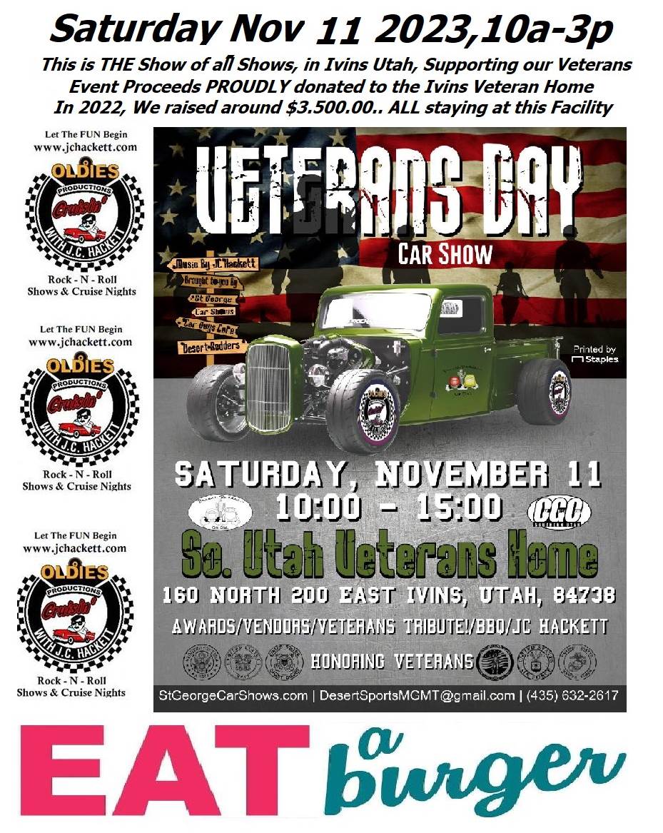 Greetings Everyone !! What a fantastic cruising Season, and ALL the thanks goes directly to each and every one of YOU! I love what "WE" do, as well as all the places and various charities and community's we do it for! YOU are some of the best people on earth! THANK YOU ALL, FOR BEING YOU! Here is a little information on a show not too far away.. It's a great way to honor and show appreciation for those who serve, and have served our country! We are in process of arranging a very special Guest Speaker, More info on the way soon, SATURDAY NOV. 11, Ivins Veteran Home, Ivins Utah. (in a land not too far away, where it is WARM!) This is a show DEDICATED to those AMAZING people who have served our COUNTRY . OUR VETERANS ! Event is being held at Southern Utah Veterans Home in Ivins Utah, AND funds raised here, STAY here at Southern Utah Veterans Home !!!!! Last year in 2022, We raised about $3,500, . and ALL of it stayed at the Ivins Veteran Home ! On Site food by EAT A BURGER! The BEST Burgers and REAL Fries in UTAH.. This event officially Starts at 10am, However Parking starts around 7am, Show runs to 3pm.. (0700 t0 1500 for those special enough to know what that is !) Cold War Medals will be issued out by the Utah Cold War Committee.. for more event info, call Darren at 435-623-2617 or website stgeorgecarshows.com .. LET'S DO THIS !!!!!!!!! ***** FUTURE EVENTS Oh Wait,,,, There is MORE .. FUTURE J.C Hackett Hosted EVENTS 4 NOV, SATURDAY LAS VEGAS NEVADA 8-4p (Entry fee includes T-shirt) Goldstrom's Nostalgia Museum Annual Car-Truck-Bike Show 5375 Cameon St, Las Vegas Nevada USA 702-876-3652 11 NOV, SAT St. George VETERANS Appreciation Car Show, Ivins Veteran Home 160n 200e Ivans Ut. 435-623-2617 <http://www.stgeorgecarshows.com> www.stgeorgecarshows.com Veterans Day 23 NOV, THU Thanksgiving Day 2 DEC, SAT SAINT GEORGE UTAH Toys for Tots, St. George CARQUEST, Car Guys Care 920n 2100w 435-619-9770 Shane 9 DEC, SAT MEQUITE NEVADA Mesquite, St. Nicks Toy Run CAR SHOW, Wedgies Sports Bar, 796w Pioneer Blvd. Entry fee, Toy(s) donation, <http://www.stgeorgecarshows.com> www.stgeorgecarshows.com 435-632-2617 24 DEC, SUN Christmas Eve 25 DEC, MON Christmas Day 31 DEC, SUN New Year's Eve 1 JAN, MON New Year's Day 17 JAN, WED 8 - 9am Spazz night 14 FEB, WED Valentine's Day 17 FEB, SAT LAS VEGAS NEVADA Red Car Show 5375 Cameron St. Las Vegas 702-876-3652 19 FEB, MON Presidents' Day 10 MAR, SUN Daylight Saving Time starts 15 MAR, FRI POCATELLO, Chrome in the Dome.(Fri-Sat Only) <mailto:info@chromeinthedome.com> info@chromeinthedome.com 16 MAR, SAT POCATELLO, Chrome in the Dome.(Fri-Sat Only) <mailto:info@chromeinthedome.com> info@chromeinthedome.com Come and join in a Fun Family Event, You will be very glad you did,, Please check our website for More of our fun, And event information <http://www.jchackett.com/events> www.jchackett.com/events If you would like to email us,, our address is <mailto:jc@jchackett.com> jc@jchackett.com If you know of anyone who would like to receive "Cruise Event Related" information, Simply have them shoot us an email.. They will be added to our mailing list, <mailto:jc@jchackett.com> jc@jchackett.com or <mailto:hackett56@comcast.net> hackett56@comcast.net As you see, it is "blind copied" so others will not get your address.. Please feel free to pass this along to your friends. A Most Important rule to follow.. BE NICE, Think of others, Give someone, ANYONE a SMILE.. You would be so surprised how it will make YOU feel! **** Please do NOT "hit reply" to this email, **** It goes to a mailing service J.C Hackett Oldies "Rock & Roll Radio" Productions Real Oldies, KCPX P.O Box 271226 Salt Lake City, Utah 84127 <http://www.jchackett.com> www.jchackett.com Email us at <mailto:jc@jchackett.com> jc@jchackett.com