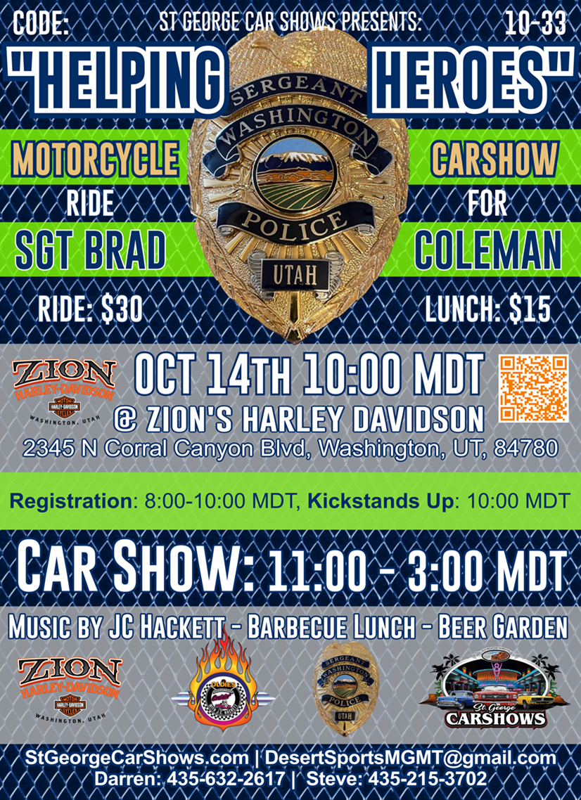 SATURDAY (in Utah's DIXIE) Join us at Zion HARLEY DAVIDSON Washington Utah, 2345n Coral Canyon Blvd. There is a "suggested Registration fee" going to Officer Brad Coleman and his family. This is a Car and Motorcycle show with Awards Dash plaques and prizes and most important, a FUND RAISER for Officer Brad Coleman, He was injured in a ATV Accident, now in a wheelchair, but in a very slow recovery process! WE CAN HELP! There is a NEW cruise route for those who would like to participate,, In and around southern Utah but NOT GOING TO, OR ENDING UP IN MESQUITE !! I do have a map of the new route, email me if you would like one .. jc@jchackett.com <mailto:jc@jchackett.com>