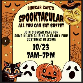SATURDAY Oct 23rd Legends Motor Co, Springville Ut. USA FREE HALLOWEEN PARTY 2-7pm (*Breakfast Dinner Deals @ Sidecar Café*) See Menu below flyer What a fantastic place for a FREE Car Show AND a Halloween Party! Just East of the Springville exit, East of Walmart. Dash Plaques, Awards, Prizes, FUN FAMILY EVENT Dress warm Bring Candy for the Little Kiddies (and no so little kiddies) $$$ 100.00 Costume Contest Grand Prize. Event times may adjust depending on weather J.C Hackett Oldies "Rock & Roll Radio" Productions Real Oldies, KCPX P.O Box 271226 Salt Lake City, Utah 84127 www.jchackett.com Email us at jc@jchackett.com