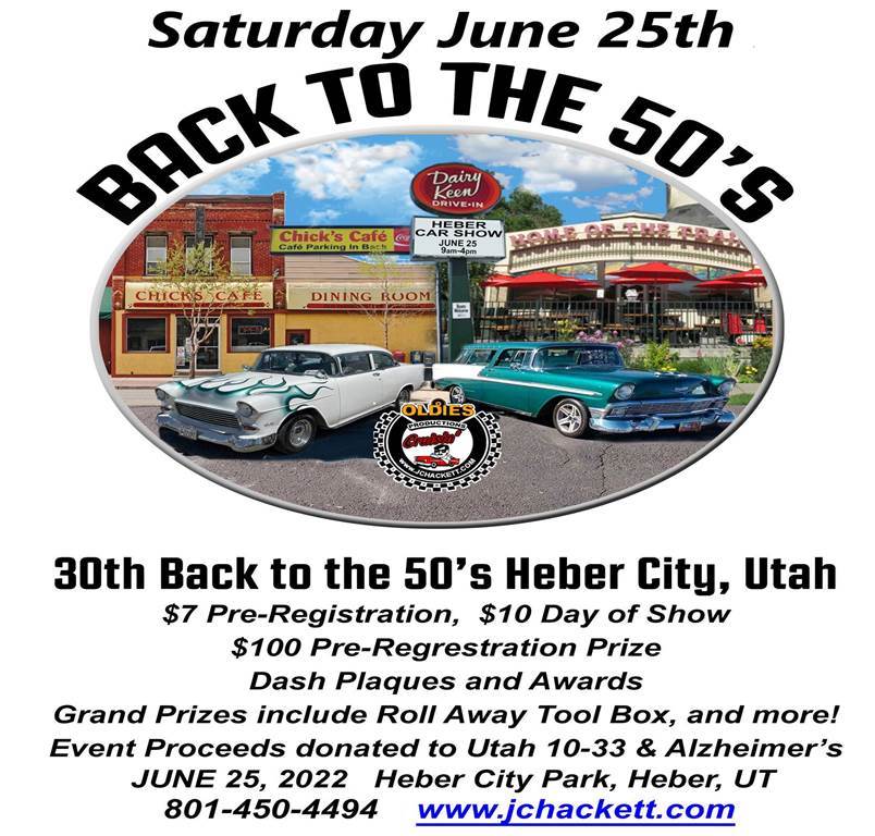 HEBER'S 30th ANNUAL Car Show, SATURDAY, Funds raised donated to the UTAH 10-33 Fund for families of Fallen Officers, and the Alzheimer's Assoc. SO many COOL prizes, A wooden handmade Moose Rockin "horse" Thanks to The Wetzel's and Carrigan's, Stand up Air Compressor, Andy K, Pin Striped Custom Back the Blue Tool box, Treasure Chest Guess, Jumper Pack, Super Cool Pedal Car(s). Ladies Bracelet, Kids "Danika Fink" Coloring contest. Custom Car Quilt, and this is only a partial list.. Awards, Dash Plaques, Prizes.. Come and "Back the Blue" with us... SATURDAY! Event open to ALL RIDES, ALL years, ALL sizes, ALL colors, ALL models', ALL and EVERYONE !! oh, Custom T-Shirts honoring two special friends who passed away recently, Artwork featuring the rides of Lew Garfield and Frank Harvey.. Special THANK YOU to all supporters who made this super 30th event possible.. YOU know who you are ! **** Please do NOT "hit reply" to this email, **** It goes to a mailing service If you would like to email us,, our address is <mailto:jc@jchackett.com> jc@jchackett.com If you know of anyone who would like to receive "Cruise Event Related" information, Simply have them shoot us an email.. They will be added to our mailing list, As you see, it is "blind copied" so others will not get your address.. Please feel free to pass this along to your friends. A Most Important rule to follow.. BE NICE, Think of others, Give someone, ANYONE a SMILE.. You would be so surprised how it will make YOU feel! J.C Hackett Oldies "Rock & Roll Radio" Productions Real Oldies, KCPX Salt Lake City, Utah 84127 www.jchackett.com <http://www.jchackett.com/> Email jc@jchackett.com <mailto:jc@jchackett.com>