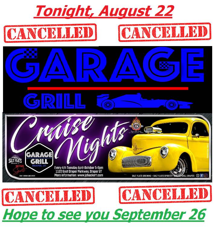So SORRY to inform everyone, MOTHER NATURE wins AGAIN !! Forecasts are simply NOT looking good at all Cruise Nights and crappy weather do not play together well. PLEASE help spread the word. ***** FUTURE EVENTS 23 AUG, WED Layton BURGERSTOP Free Cruise Night, 5/8 FREE CRUISE NIGHT CAR SHOW 323e Gentile St 801-544-8090 24 AUG, THU 5-8pm West Valley City, Valley Fair Mall FREE Cruise Night, FREE CRUISE NIGHT CAR SHOW East Side by Springhill Suites.. 25 AUGUST, FRIDAY 5-7p SARATOGA CARQUEST FREE CRUISE NIGHT/CAR SHOW (Free Burgers & Hot Dogs) 2184n Redwood Road Saratoga Springs Utah 801-753-9811 26 AUG, SAT 9a-4p COPPERTON Town Days CAR SHOW 8090w 10305s 801-201-5164 28 AUG, MON Kruisers for Kids Donation Cruise 801-560-3797 2 SEP, SAT Parowan Utah, - <mailto:fair@ironcounty.net> fair@ironcounty.net 435-477-8380 4 SEP, MON Iron County Fair Car Show, Parowan Utah, - <mailto:fair@ironcounty.net> fair@ironcounty.net 435-477-8380 Please check our website for More of our fun, And event information <http://www.jchackett.com/events> www.jchackett.com/events If you would like to email us,, our address is <mailto:jc@jchackett.com> jc@jchackett.com If you know of anyone who would like to receive "Cruise Event Related" information, Simply have them shoot us an email.. They will be added to our mailing list, As you see, it is "blind copied" so others will not get your address.. Please feel free to pass this along to your friends. A Most Important rule to follow.. BE NICE, Think of others, Give someone, ANYONE a SMILE.. You would be so surprised how it will make YOU feel! **** Please do NOT "hit reply" to this email, **** It goes to a mailing service