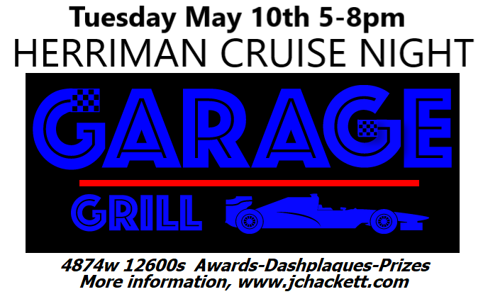 Come and join in TONIGHT.. Awards- Dash Plaques- Specialty Awards Door prizes, GIFT CARDS, FREE REGISTRATION and more!!! Drop by for great food and the ultimate Hot-Rod/Car dining experience. Most tables are UNDER exotic vehicles perched on 4-post lifts What a fantastic collection of world famous Race Cars. Future Events 10 MAY, TUE Herriman Garage Grill, FREE Cruise Night 4874w 12600s 5/8 11 MAY, WED Springville, LEGENDS FREE CRUISE NIGHT, 1715w 500s 801-489-0889 12 MAY, THU CANCELLED - GODFATHERS - SOLD 14 MAY, SAT Heber Carquest Free Car Show Grand opening, 434n Main St. 8/3p. 435-654-1520 19 MAY, THU 5-8p Day Break, SoDa Row FREE Cruise Night 11248 Kestrel Rise Road, South Jordan 20 MAY, FRI UVU Swap Meet, Orem 21 MAY, SAT UVU Car Show & Swap Meet 22 MAY, SUN JELSCO FREE CAR SHOW 1150n Hwy 89, Harrisville Ut. 801-782-7574 23 MAY, MON (Special Date for May) Shake Shack FREE Cruise Night,6123s State 5/8p 801-448-7907 24 MAY, TUE DRAPER Garage Grill, FREE Cruise Night 1122e Draper Parkway (12600s) 25 MAY, WED Layton Burger Stop, 323e Gentile Rd, Layton, FREE CRUISE NIGHT 801-544-8090 26 MAY, THU West Valley City, Valley Fair Mall Free Cruise night, 2700w 3600s 5/8p 27 MAY, FRI Mountain View Village FREE Car Show, Grand opening, 4/8p 4608w Partridge Hill Lane, Riverton 28 MAY, SAT Memorial weekend 29 MAY, SUN Memorial Weekend 30 MAY, MON Memorial Day **** Please do NOT "hit reply" to this email, **** It goes to a mailing service If you would like to email us,, our address is <mailto:jc@jchackett.com> jc@jchackett.com If you know of anyone who would like to receive "Cruise Event Related" information, Simply have them shoot us an email.. They will be added to our mailing list, As you see, it is "blind copied" so others will not get your address.. Please feel free to pass this along to your friends. A Most Important rule to follow.. BE NICE, Think of others, Give someone, ANYONE a SMILE.. You would be so surprised how it will make YOU feel! J.C Hackett Oldies "Rock & Roll Radio" Productions Real Oldies, KCPX Salt Lake City, Utah 84127 <http://www.jchackett.com/> www.jchackett.com Email <mailto:jc@jchackett.com> jc@jchackett.com