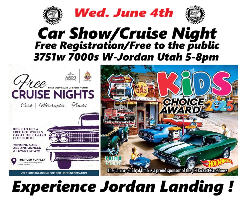 Hey. LOOK !! It's time for . CRUISE NIGHT at JORDAN LANDING !!! Right by the RUSH Fun complex and across the street from FAMOUS DAVES BBQ !! 7273s Plaza Center Drive, (3751w) West Jordan, Utah Registration is FREE, Awards, Dash Plaques, and Jax Wax door prizes! Special Kids Choice award hosted by.. The Camaro Club of Utah ! All Kids vote on the "Ride" of their choice, and get a free Hot Wheel Car, Compliments of the Camaro Club and tier Family of supporters! New event flyers always available.. Oh, Wait .. There more, .. than a little More.. Here's a little list of 2025 events we have scheduled.. Make a plan to join in.. Anytime you can, Check our Website for just a few more !! . <http://www.jchackett.com/> www.jchackett.com 4 Jun, Wed 5-8p Jordan Landing FREE Cruise Night, 3751w 70th s. 801-282-1400 5 Jun, Thu 8 - 9am R. F. U '25, Manti Utah 6 Jun, Fri 8 - 9am R F U.. '25 Manti Utah 7 Jun, Sat 9-3p MALAD IDAHO, Car Show on Main Street, 65n Main St. Special Prizes, t-shirts, Awards, and fantastic Hospitality! 10 Jun, Tue 5-8p Murray, Shake Shack FREE Cruise Night, 6123s State 801-448-7907 11 Jun, Wed CANCELLED Valley Fair Mall, FREE Cruise Night 3600s 2700w 801-871-2341 14 Jun, Sat Sounds of Freedom Car-Truck-Bike Show Layton Commons Park 437n Wasatch Drive Hosted by WASATCH CUSTOMS 801-771-3868 15 Jun, Sun Father's Day 19 Jun, Thu South Jordan Daybreak/Soda Row FREE Cruise Night **Back to Parking on the Grass AND Main Street!** 11248s 4700w 801-204-2775 21 Jun, Sat Sigurd Car Show, Sigurd City Park 801-458-0493 Gary 9a-2p 23 June 23, Monday Home Builders Assn. Wyatt Page Memorial Car Show 38w 138775s, 6-8pm Fundraiser for Wyatt's comfort bundles FREE Car-Truck-Bike Show Doug Page 801-360-6575 24 June, Tuesday DRAPER GARAGE GRILL FREE Cruise Night 4-8pm 1122e 12300s 25 Jun, Wed LayTon BurgerStop FREE Cruise Night, 323e Gentile Rd 801-544-8090 27 Jun, Fri Heber.. Welcome Party, Heber City Park, 6pm 801-450-4494 28 Jun, Sat Heber Car Show, Heber City Park 8-3p 801-450-4494 3 Jul, Thu Cache Valley Cruise-in Car Show, Cache Valley Fairgrounds 435-787-7414 Thursday, July 3 8 - 9am Cvca CONCERT 4 Jul, Fri Cache Valley Cruise-in Car Show, Cache Valley Fairgrounds 435-787-7414 Friday, July 4 Independence Day Cvca CONCERT, 6pm 4 Jul, Fri Cache Valley Cruise-in Car Show, Cache Valley Fairgrounds 435-787-7414 5 Jul, Sat Cache Valley Cruise-in Car Show, Cache Valley Fairgrounds 435-787-7414 **** Please do NOT "hit reply" to this email, **** It goes to a mailing service If you would like to email us,, our address is <mailto:jc@jchackett.com> jc@jchackett.com If you know of anyone who would like to receive "Cruise Event Related" information, Simply have them shoot us an email.. They will be added to our mailing list, As you see, it is "blind copied" so others will not get your address.. Please feel free to pass this along to your friends. A Most Important rule to follow.. BE NICE, Think of others, Give someone, GIVE ANYONE a SMILE.. You would be so surprised how it will make YOU feel! CHECK OUR WEBSITE FOR MORE 2025 EVENTS J.C Hackett Oldies "Rock & Roll Radio" Productions Real Oldies, KCPX P.O Box 271226 Salt Lake City, Utah 84127 Website <http://www.jchackett.com> www.jchackett.com Email us at <mailto:jc@jchackett.com> jc@jchackett.com