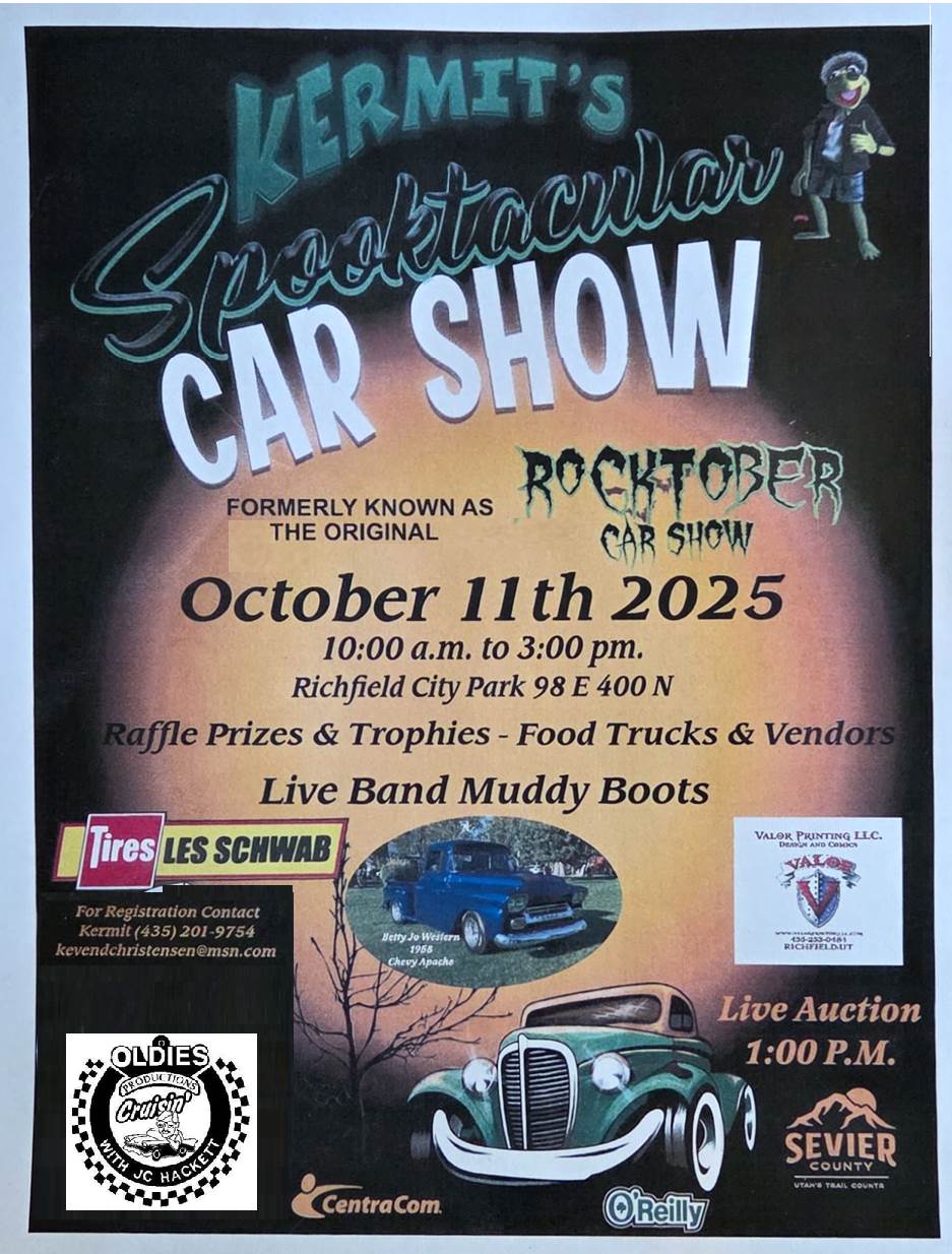 Official REPORT.. (Late breaking News) Boy, did we have a super great time over last weekend at the Carmel Mountain Car Show.. Games, Awards, You-tube Celebrities, 163+ Registered! A heartfelt THANK YOU to all who attended and supported this spectacular Event! Who would ever think a Car Show actually setting on a beautiful Golf Course! ABSOLUTLEY AMAZING! Checkout a few pictures on our Facebook or Stacy Cox Photography https://stacycoxphotography.com Be sure to book your rooms and/or RV spots for 2026! The date Has been set for September 25 & 26th.. Mt Carmel Junction, USA Gordon, 435-648-2203 or 435-648-2262 Greetings Everyone !! Come and join us for Something new! Keven (AKA KERMIT) is hosting a Car Show in Richfield City Park. He and his FAMILY OF FRIENDS originally stated this event years ago Now they are turning back the page of time, and hosting what they do best CAR SHOWS that serve the community! They will have Awards, Prizes, a "live auction" and, and,, Not one, but TWO firearms to be given away! Also.. are you ready to win a 1967 THUNDERBIRD ? WHAT A SHOW !!!!!! We will be there serving up our music memories by request of course! Special Dash Plaques and Awards, and FREE "Don't Touch" window cards!! Official Rumor is. JAX WAX will be attending, all stocked up for your "clean needs" If you would like to make a difference, and have some FAMILY FUN.. Come and join us ! Oh, Wait, There more,. ok, a little More than a little.. Here's a little list of 2025 events we have scheduled.. Make a plan to join in.. Anytime you can, Check our Website <http://www.jchackett.com> www.jchackett.com 1 Oct, Wed Jordan Landing FREE Cruise Night, 3751w 70th s. 801-282-1400 4 October Saturday CANCELLED Jordanelle State Park Campground Car-Truck-BOAT-Bike Show 801-822-8151 or 801-655-3067 4 Oct, Sat CANCELLED Kulture Krash, Copperton Town Park, 7 Oct, Tue LEHI, One Man Band FREE Cruise Night 801-766-0553 8 October, Wednesday 5-8p VALLEY FAIR MALL Free HALLOWEEN STYLE CRUISE NIGHT 3600s 2700w East Side 10 October Friday BEAVER CARQUEST Free Customer Appreciation Car Show 85n Main Street, Beaver Utah 435-438-2347 Saturday, October 11 8 -3pm **SPOOKTACULAR** The Original ROCKTOBER Car Show, Kermit's show Enter to win a 1967 THUNDERBIRD 98e 400n, Richfield City Park, 435-201-9754 13 Oct, Mon Columbus Day 14 Oct, Tue Murray, Shake Shack FREE Cruise Night, Halloween Style Trunk N Treat 6123s State 801-448-7907 16 Oct, Thu South Jordan Daybreak/Soda Row FREE Cruise Night Halloween Style Trunk N Treat 11248s 4700w 801-204-2775 18 October Sat C-10 Halloween Party FREE Car/TRUCK Show 801-833-3439 22 Oct, Wed LayTon BurgerStop FREE Cruise Night, Halloween Style Trunk N Treat 323e Gentile Rd 801-544-8090 24 Oct, Fri CEDAR CITY CARQUEST 377n 2150w 435-586-3834 25 Oct, Sat Washington, 1st Responders Car Show, New Location in Washington Ut. 435-632-2617 27 Oct, Mon St. George Car-Truck-Bike Show at The Cottages, Darren 435-623-2617 28 October, PENDING !! HALLOWEEN PARTY DRAPER GARAGE GRILL 12300s 1300e 31 Oct, Fri Halloween 2 Nov, Sun Daylight Saving Time ends 4 Nov, Tue Election Day 8 Nov, Sat Las Vegas, Art Goldstrom's Memorial Car-Truck-Bike show, 5375 Cameron St 702-876-3652 11 Nov, Tue Veterans Day 15 Nov, Sat Ivins Veteran Appreciation Car-Truck-Bike Show , 160n 200e 435-623-2617 Darren 27 Nov, Thu Thanksgiving Day 6 Dec, Sat St. George, Toys for Tots, Car-Truck-Bike Show, Digby's Market, 1155 Snow Canyon Parkway, 435-623-2617 Darren 21 February 2026 Red Car Show, Nostalgia Street Rods Las Vegas Nevada, 702-503-5389 Randall March 6-7 2026 Friday & Saturday ONLY Pocatello Chrome in the Dome **** Please do NOT "hit reply" to this email, **** It goes to a mailing service If you would like to email us,, our address is <mailto:jc@jchackett.com> jc@jchackett.com If you know of anyone who would like to receive "Cruise Event Related" information, Simply have them shoot us an email.. They will be added to our mailing list, As you see, it is "blind copied" so others will not get your address.. Please feel free to pass this along to your friends. A Most Important rule to follow.. BE NICE, Think of others, Give someone, GIVE ANYONE a SMILE.. You would be so surprised how it will make YOU feel! CHECK OUR WEBSITE FOR MORE 2025 EVENTS