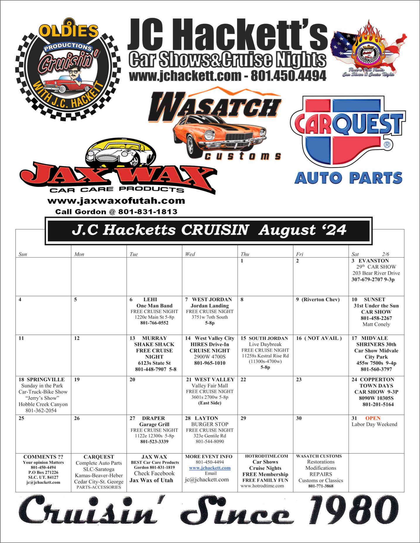Just thought I would share Our August Events.. Oh, Wait.. There is MORE !! Here's a little list of 2024 events we have scheduled.. Make a plan to join in.. Anytime you can, Check our Website for just a few more. <http://www.jchackett.com/> www.jchackett.com JUL 16, TUE MURRAY, Shake Shack Cruise Night, 6123s State St. 801-448-7907 JUL, 17 WED West Valley City, Valley Fair Mall FREE Cruise Night.. 3601s 2700w, East Side JUL 18, THU South Jordan, Live Daybreak, SODA ROW Cruise Night, 11258s Kestral Rise Road, (11300s4700w) JUL 20, SAT KAMAS, FREE Car Show JUNKIE.. Kamas City Park 300n Main St 435-640-2160 or 435-783-6777 JUL 23, TUE NO DRAPER, Garage Grill Cruise Night, for July 801-523-3339 JUL 26, FRI Wells Fun Run - 32nd Annual 775-752-1153 JUL 27, SAT Wells Fun Run 775-752-1153 JUL 28, SUN Wells Fun Run 775-752-1153 JUL 30, TUE Highland FREE Car Show Highland City Park, 10400n Alpine Highway 801-376-2806 Lane Downs JUL 31, WED LAYTON, Burger Stop FREE Cruise Night, 323e Gentile Rd. 801-544-8090 AUG 2, Friday, 6pm Evanston (30th) Annual Car Show, Pot Luck Welcome Party Hamblin Park, 203 Bear River DR. 307-679-1810 Scott AUG 3, SAT 8-4p Evanston (30th) Annual Car Show Hamblin Park 203 Bear River DR. (Show Parking on the nice COOL Grass) 307-679-1810 Scott AUG 6, TUE LEHI, One Man Band FREE Cruise Night, 1220e Main, 801-766-0552 AUG 7, WED West Jordan, Jordan Landing FREE Cruise Night, 3751w 70th s. AUG 9, FRI FREE Riverton Chevrolet FREE Car Show 1110 South Jordan Gateway Open to any make, any year, size, color 801-330-0951 Kevin Wild AUG 10, SAT 8-3p Sunset, Under the Shade Annual FREE Car Show, Rachael Runyan park, 200w 875n Sunset Utah 801-458-2267 AUG 13, TUE MURRAY, Shake Shack FREE Cruise Night, 6123s State St. 801-448-7907 AUG 14, WED West Valley City, FREE HIRES Drive-in, Cruise Night 2900w 4700s 801-965-1010 AUG 15, THU South Jordan, Live Daybreak, SODA ROW FREE Cruise Night, 11258s Kestral Rise Road, (11300s4700w) AUG 17, SAT MIDVALE-Kruisers 4 Kids, Shriners Car Show, Midvale City Park, 455w 7500s 801-560-3797 AUG 18, SUN Springville, Sunday in the Park, Jerry's Show! Rotary Park. Hobble Creek Canyon.. 801-362-2054 AUG 21, WED West Valley City, Valley Fair Mall FREE Cruise Night.. 3601s 2700w, East Side AUG 24, SAT COPPERTON DAYS, Car Show, Copperton City Park, 8090w 10305s 801-201-5164 AUG 27, TUE DRAPER, Garage Grill FREE Cruise Night, 1122e 12300s 801-523-3339 AUG 28, WED LAYTON, Burger Stop FREE Cruise Night, 323e Gentile Rd. 801-544-8090 SEP 2, MON Iron County Fair. 435-632-2617 Monday, September 2 Labor Day SEP 3, TUE LEHI, One Man Band FREE Cruise Night, 1220e Main, 801-766-0552 SEP 4, WED West Jordan, Jordan Landing FREE Cruise Night, 3751w 70th s, SEP 7, SAT PEACH DAYS FREE FREE CAR SHOW, Pioneer Park, 600w Forest St 435-723-3981 SEP 10, TUE MURRAY, Shake Shack FREE Cruise Night, 6123s State St. 801-448-7907 **** Please do NOT "hit reply" to this email, **** It goes to a mailing service If you would like to email us,, our address is <mailto:jc@jchackett.com> jc@jchackett.com If you know of anyone who would like to receive "Cruise Event Related" information, Simply have them shoot us an email.. They will be added to our mailing list, As you see, it is "blind copied" so others will not get your address.. Please feel free to pass this along to your friends. A Most Important rule to follow.. BE NICE, Think of others, Give someone, GIVE ANYONE a SMILE.. You would be so surprised how it will make YOU feel! CHECK OUR WEBSITE FOR MORE 2024 EVENTS J.C Hackett Oldies "Rock & Roll Radio" Productions Real Oldies, KCPX P.O Box 271226 Salt Lake City, Utah 84127 <http://www.jchackett.com> www.jchackett.com Email us at <mailto:jc@jchackett.com> jc@jchackett.com