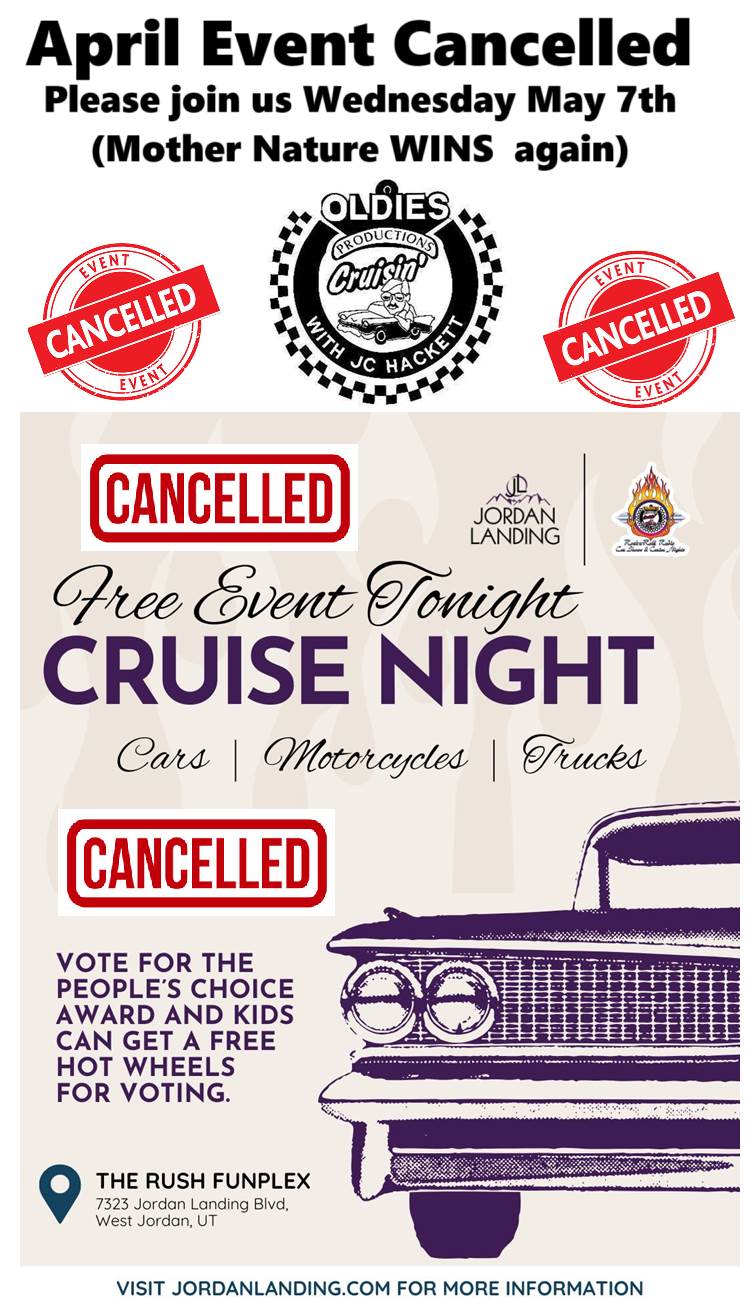 Oh, Wait .. There more than a little More.. Here's a little list of 2025 events we have scheduled.. Make a plan to join in.. Anytime you can, Check our Website for just a few more. <http://www.jchackett.com/> www.jchackett.com POSTPONED TO APRIL 15TH Apr, Tue 5-8pm LEHI, One Man Band FREE Cruise Night 801-766-0553 CANCELLED 2 Apr, Wed 5-8pm Jordan Landing FREE Cruise Night, (Weather pending) 3751w 70th s. 801-282-1400 8 Apr, Tue 5-8pm Murray, Shake Shack FREE Cruise Night, 6123s State 801-448-7907 9 Apr, Wed (PENDING) Valley Fair Mall, FREE Cruise Night 3600s 2700w 801-969-6211 12 Apr, Sat Havoc St. George 300n 300n, Washington Elem 9a-3p 435-623-2617 Darren 15 Apr, Tue -- 5-8pm LEHI, One Man Band FREE Cruise Night 1220e Main St. Lehi Utah 801-766-0553 (Tax Day) 17 Apr, Thu (NO APRIL EVENT, See you May 15th) South Jordan Daybreak/Soda Row FREE Cruise Night 11248s 4700w 801-204-2775 19 Apr, Sat 10a - 1p Summit Harley, 555 Geneva Road, Car-Truck-Motorcycle Show Proceeds donated to Utah Patriot Riders Awards-Dash Plaques-Prizes 385-203-8542 20 Apr, Sun Easter Sunday 21 Apr, Mon Easter Monday 23 Apr, Wed LayTon Burger Stop FREE Cruise Night, 323e Gentile Rd 801-544-8090 25 Apr, Fri FREE FRIDAY NIGHT MOAB CARQUEST Car Show 1010s Main Street, 4-7pm 435-260-1948 26 Apr, Sat MOAB Car Show, 435-260-1948 2 May, Fri Page Car Show Welcome Party Cruise & Registration 928-645-9023 3 May, Sat Page Arizona Warren Whistler Memorial Car Show, Page City Park, 600n Navajo 928-691-0042 <mailto:capage@yahoo.com> capage@yahoo.com **** Please do NOT "hit reply" to this email, **** It goes to a mailing service If you would like to email us,, our address is <mailto:jc@jchackett.com> jc@jchackett.com If you know of anyone who would like to receive "Cruise Event Related" information, Simply have them shoot us an email.. They will be added to our mailing list, As you see, it is "blind copied" so others will not get your address.. Please feel free to pass this along to your friends. A Most Important rule to follow.. BE NICE, Think of others, Give someone, GIVE ANYONE a SMILE.. You would be so surprised how it will make YOU feel! CHECK OUR WEBSITE FOR MORE 2025 EVENTS <http://www.jchackett.com> www.jchackett.com J.C Hackett Oldies "Rock & Roll Radio" Productions Real Oldies, KCPX P.O Box 271226 Salt Lake City, Utah 84127 Email us at <mailto:jc@jchackett.com> jc@jchackett.com -- This email has been checked for viruses by Avast antivirus software. www.avast.com