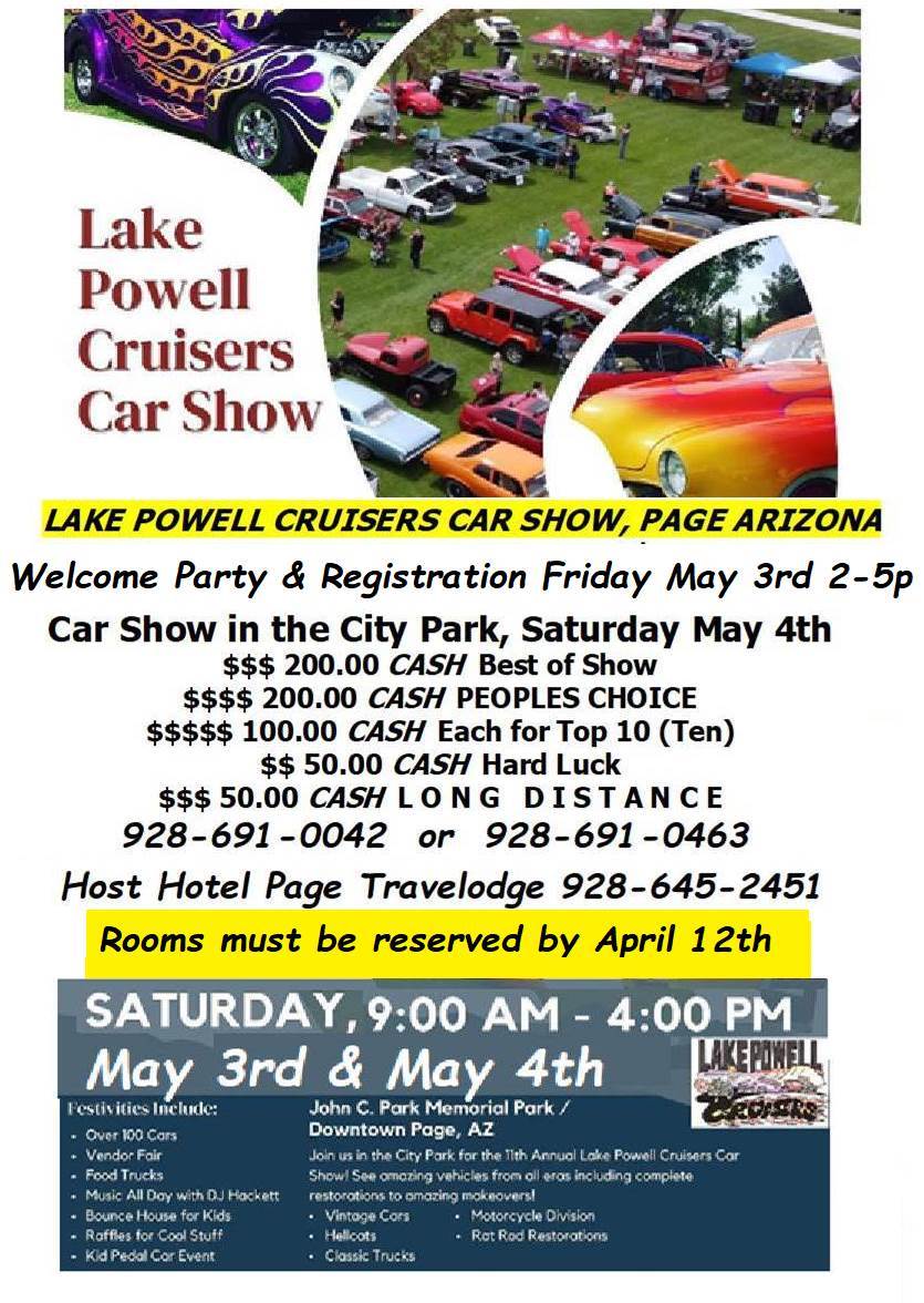 We have been associated with the Lake Powell Car show since 2006, 18 years of building a great "Family of Friends" at their Amazing Show. While some changes have come and gone, this event has grown into a fun And fantastic Car Show benefiting their community and exhibitors. When asking those who have attended, we have always been told Its very well worth The Miles, and the Smiles ! The tour of the Page area is escorted by local Police and Park Rangers. The Host club prides itself on CASH PRIZES and awards! We are always greeted with excellent hospitality at local Restaurants & Hotels. Take our advice and give this show a try.. you will be very glad you did! Jc Up Coming Future Events. Here is a little list of events we have scheduled.. Anytime you can, Make a plan to join in.. Check our Website for just a few more. www.jchackett.com <http://www.jchackett.com> 31 MAR, SUN Easter Sunday 2 APR, TUE 5-8 LEHI, One Man Band FREE Cruise Night, 1220e Main, 801-766-0552 3 APR, WED FREE CRUISE NIGHT 5-8 West Jordan, Jordan Landing Cruise Night, 3751w 70th s, Across from the RUSH Complex 5 APR, FRI Carquest FREE Cruise Night, Mount Pleasant Utah 180w Main St 435-462-2605 6 APR, SAT Carquest Free Cruise Night Saratoga Springs 2184n Redwood Road, Saratoga Utah 385-287-0250 9 APR, TUE MURRAY, Shake Shack Cruise Night, 6123s State St. 801-448-7907 NO APRIL Hires Cruise Night West Valley City, HIRES Drive-in, 2900w 4700s 801-965-1010 (See you May 15) 11 APR, THU Beaver City Utah Carquest FREE Cruise Night, 85n Main St, 435-438-2347 12 APR, FRI Cedar City Utah Carquest FREE Cruise Night, 377n 2150w 435-586-3834 13 APR, SAT St. George HAVOC Car Show, Washington City Elementary, 300n 300e Win 2 Jet Blue Tickets to ANYWHERE they fly!! 435-623-2617 www.stgeorgecarshows.com <http://www.stgeorgecarshows.com> 15 APR, MON Tax Day 17 APR, WED West Valley City, Valley Fair Mall Cruise Night.. 3601s 2700w, East Side NO APRIL South Jordan, Live Daybreak, SODA ROW Cruise Night, Hope to see you May 16 20 APR, SAT **PENDING** LINDON, Time Harley Car/Truck/Bike Show 555 Geneva Rd. 801-434-4647 23 APR, TUE DRAPER, Garage Grill Cruise Night, 1122e 12300s 801-523-3339 24 APR, WED LAYTON, Burger Stop Cruise Night, 323e Gentile Rd. 901-544-8090 26 APR, FRI 4-7p Moab Carquest FREE Cruise Night 1010s Main St 435-259-2413 (South-East end of town) 27 APR, SAT Moab 1 MAY, WED West Jordan, Jordan Landing Cruise Night, 3751w 70th s, 3 MAY, FRI Page Arizona, Welcome Party and Cruise, Page Lumber store, 928-691-0042 4 MAY, SAT Page Arizona Warren Whistler Memorial Car Show, Page City Park, 600n Navajo 928-691-0042 capage@yahoo.com <mailto:capage@yahoo.com> **** Please do NOT "hit reply" to this email, **** It goes to a mailing service If you would like to email us,, our address is <mailto:jc@jchackett.com> jc@jchackett.com If you know of anyone who would like to receive "Cruise Event Related" information, Simply have them shoot us an email.. They will be added to our mailing list, As you see, it is "blind copied" so others will not get your address.. Please feel free to pass this along to your friends. A Most Important rule to follow.. BE NICE, Think of others, Give someone, ANYONE a SMILE.. You would be so surprised how it will make YOU feel! CHECK OUR WEBSITE FOR MORE 2024 EVENTS WWW.jchackett.com <http://WWW.jchackett.com> J.C Hackett Oldies "Rock & Roll Radio" P.O Box 271226 Salt Lake City, Utah 84127 www.jchackett.com <http://www.jchackett.com> 801-450-4494
