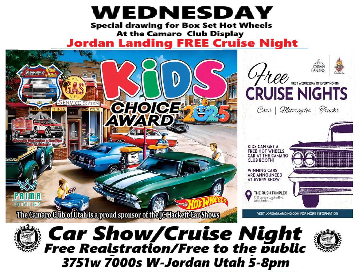 WEDNESDAY 5-8pm-- Join us at JORDAN LANDING,, Extra Special KIDS CHOICE Display and Drawing for 2 Hot Wheel Box Sets ! Kids Vote on their Favorite entry, And, Spectator Favorite Scan to vote, Awards, Dash Plaques, Specialty Awards, Jax Wax Award Enter to win entry passes for World of speed tickets & Poster And, And, AND.. Drop by to see "Someone's" STUNNING NEW CAR !!! ALWAYS FREE REGISTRATION AND FREE TO THE PUBLIC Open to any and all Makes, Years, Sizes! Oh, Wait .. There more, .. than a little More.. Here's a little list of 2025 events we have scheduled.. Make a plan to join in.. Anytime you can, Check our Website for just a few more !! . <http://www.jchackett.com/> www.jchackett.com 3 Sep, Wed Jordan Landing FREE Cruise Night, 3751w 70th s. 801-282-1400 6 Sep, Sat 9a -4p Brigham City, Peach Days Car Show Watkins Park, 650w Forest Street 801-458-2267 9 Sep, Tue Murray, Shake Shack FREE Cruise Night, 6123s State 801-448-7907 12 September, Friday Price CARQUEST 720e Main Street 435-637-5190 13 September, Saturday Mt. Pleasant CARQUEST 180w Main Street 435-462-2605 18 Sep, Thu South Jordan Daybreak/Soda Row FREE Cruise Night 11248s 4700w 801-204-2775 23 Sept, Thursday DRAPER GARAGE GRILL 12300s 1300e 24 Sep, Wed LayTon BurgerStop FREE Cruise Night, 323e Gentile Rd 801-544-8090 26 Sep, Fri Carmel Mtn Car Show Welcome Party 27 Sep, Sat Carmel Mtn Car Show, Thunderbird Lodge, Mt. Carmel Junction 1 Oct, Wed Jordan Landing FREE Cruise Night, 3751w 70th s. 801-282-1400 4 October Saturday Jordanelle State Park Campground Car-Truck-BOAT-Bike Show 801-822-8151 or 801-655-3067 4 Oct, Sat CANCELLED Kulture Krash, Copperton Town Park, 7 Oct, Tue LEHI, One Man Band FREE Cruise Night 801-766-0553 10 October Friday BEAVER CARQUEST 85n Main Street, Beaver Utah 435-438-2347 Saturday, October 11 8 -3pm Kermit's show Richfield Utah 13 Oct, Mon Columbus Day 14 Oct, Tue Murray, Shake Shack FREE Cruise Night, 6123s State 801-448-7907 16 Oct, Thu South Jordan Daybreak/Soda Row FREE Cruise Night 11248s 4700w 801-204-2775 18 October Sat C-10 Halloween Party FREE Car/TRUCK Show 801-833-3439 22 Oct, Wed LayTon BurgerStop FREE Cruise Night, 323e Gentile Rd 801-544-8090 24 Oct, Fri CEDAR CITY CARQUEST 377n 2150w 435-586-3834 25 Oct, Sat Washington, 1st Responders Car Show, Washington Elem. School 435-632-2617 27 Oct, Mon St. George Car-Truck-Bike Show at The Cottages, Darren 435-623-2617 28 October, Thursday HALLOWEEN PARTY DRAPER GARAGE GRILL 12300s 1300e 31 Oct, Fri Halloween 2 Nov, Sun Daylight Saving Time ends 4 Nov, Tue Election Day 8 Nov, Sat Las Vegas, Art Goldstroms Memorial Car-Truck-Bike show, 5375 Cameron St 702-876-3652 11 Nov, Tue Veterans Day 15 Nov, Sat Veterans Memorial Car-Truck-Bike show, 200e 160n, Ivins Utah 435-623-2617 11 Nov, Tue Veterans Day 15 Nov, Sat Ivins Veteran appreciation Car-Truck-Bike Show , 160n 200e 435-623-2617 Darren 27 Nov, Thu Thanksgiving Day 6 Dec, Sat St. George, Toys for Tots, Car-Truck-Bike Show, Digby's Market, 1155 Snow Canyon Parkway, 435-623-2617 Darren 21 February 2026 Red Car Show, Nostalgia Street Rods Las Vegas Nevada, 702-503-5389 Randall March 6-7 2026 Friday & Saturday ONLY Pocatello Chrome in the Dome **** Please do NOT "hit reply" to this email, **** It goes to a mailing service If you would like to email us,, our address is <mailto:jc@jchackett.com> jc@jchackett.com If you know of anyone who would like to receive "Cruise Event Related" information, Simply have them shoot us an email.. They will be added to our mailing list, As you see, it is "blind copied" so others will not get your address.. Please feel free to pass this along to your friends. A Most Important rule to follow.. BE NICE, Think of others, Give someone, GIVE ANYONE a SMILE.. You would be so surprised how it will make YOU feel! CHECK OUR WEBSITE FOR MORE 2025 EVENTS J.C Hackett Oldies "Rock & Roll Radio" Productions Real Oldies, KCPX P.O Box 271226 Salt Lake City, Utah 84127 Website <http://www.jchackett.com> www.jchackett.com Email us at <mailto:jc@jchackett.com> jc@jchackett.com