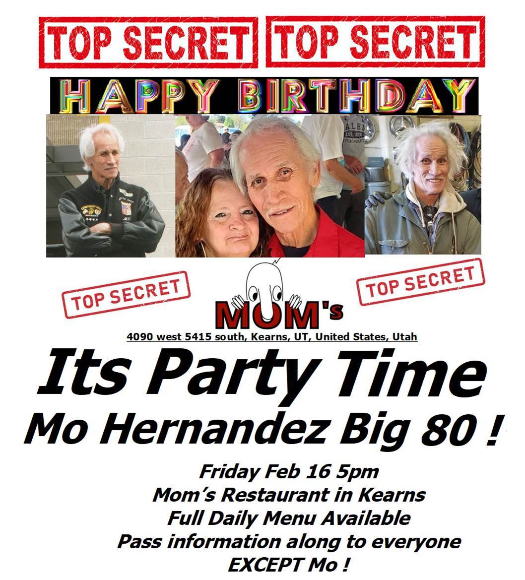 Mo Hernandez His birthday is coming up quick L.J Has put together a Suprise Birthday Party for him TOTAL SECRET This is NOT on face book, we are spreading the invitation via email And word of mouth only DO NOT TELL MO !! EVERYONE is invited, EVERYONE is welcome Enjoy the food and hospitality of Mom's Restaurant in Kearns They have a full menu, and while supplies last FRIDAY IS PRIME RIB NIGHT Everything is reasonably priced, Great Hospitality, Down home Cooking ! Let's pack the place,, SHOW SOME LOVE FOR MO ! (it really is so long overdue)