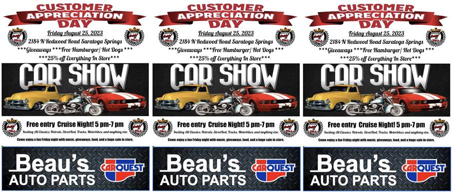 FRIDAY AUGUST 25th Saratoga Springs CARQUEST CRUISE NIGHT, 2184n Redwood Road, Super easy to find, 3 miles south of Camp Williams on Redwood Road. FREE Cruise Night FRIDAY, ... FREE Burgers & Hot Dogs FRIDAY, oh, wait, there's more! AWARDS-DASH PLAQUES, Friends and FUN at Event runs from 5 to 7pm.. oh AND 25% off EVERYTHING is the Parts Store! .. How is that for a "Cruise Night/Car Show" ???? FUTURE EVENTS 24 AUG, THU 5-8pm West Valley City, Valley Fair Mall FREE Cruise Night, FREE CRUISE NIGHT CAR SHOW East Side by Springhill Suites.. 25 AUGUST, FRIDAY 5-7p SARATOGA CARQUEST FREE CRUISE NIGHT/CAR SHOW (Free Burgers & Hot Dogs) 2184n Redwood Road Saratoga Springs Utah 801-753-9811 26 AUG, SAT 9a-4p COPPERTON Town Days CAR SHOW 8090w 10305s 801-201-5164 28 AUG, MON Kruisers for Kids Donation Cruise 801-560-3797 2 SEP, SAT Parowan Utah, - <mailto:fair@ironcounty.net> fair@ironcounty.net 435-477-8380 4 SEP, MON Iron County Fair Car Show, Parowan Utah, - <mailto:fair@ironcounty.net> fair@ironcounty.net 435-477-8380 Please check our website for More of our fun, And event information <http://www.jchackett.com/events> www.jchackett.com/events If you would like to email us,, our address is <mailto:jc@jchackett.com> jc@jchackett.com If you know of anyone who would like to receive "Cruise Event Related" information, Simply have them shoot us an email.. They will be added to our mailing list, As you see, it is "blind copied" so others will not get your address.. Please feel free to pass this along to your friends. A Most Important rule to follow.. BE NICE, Think of others, Give someone, ANYONE a SMILE.. You would be so surprised how it will make YOU feel! **** Please do NOT "hit reply" to this email, **** It goes to a mailing service
