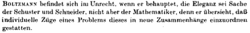 Franz von Krbek in his Eingefangenes Unendlich (1952) writes: http://chesswanks.com/txt/Boltzmann.jpg My clumsy attempt at translation: Boltzmann finds himself in the wrong when he claims elegance belong to the shoemaker and the tailor, but not the mathematician, because he overlooks the fact that individual features of a problem allows rearrangement into new contexts.