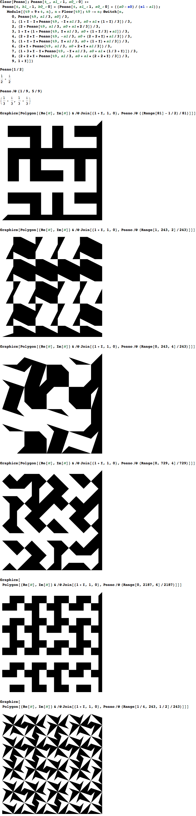 In spite of fylfotphobia, I couldn't resist: In[231]:= Clear[Peano]; Peano[t_, a1_: 1, a0_: 0] := Peano[t, b1_: 1, b0_: 0] = (Peano[t, s1_: 1, s0_: 0] = ((a0 - s0)/(s1 - a1)); Module[{t9 = 9*t, n}, n = Floor[t9]; t9 -= n; Switch[n, 0, Peano[t9, a1/3, a0]/3, 1, (1 + I - I*Peano[t9, -I*a1/3, a0 + a1*(1 + I)/3])/3, 2, (2 + Peano[t9, a1/3, a0 + a1*2/3])/3, 3, 1 + I*(1 + Peano[t9, I*a1/3, a0 + (1 + I/3)*a1])/3, 4, (2 + 2*I - Peano[t9, -a1/3, a0 + (2 + 2*I)*a1/3])/3, 5, (1 + I + I*Peano[t9, I*a1/3, a0 + (1 + I)*a1/3])/3, 6, (2*I + Peano[t9, a1/3, a0 + 2*I*a1/3])/3, 7, (1 + 3*I - I*Peano[t9, -I*a1/3, a0 + a1*(1/3 + I)])/3, 8, (2 + 2*I + Peano[t9, a1/3, a0 + a1*(2 + 2*I)/3])/3, 9, 1 + I]]) In[232]:= Peano[1/2] Out[232]= 1/2 + I/2 In[233]:= Peano /@ {1/9, 5/9} Out[233]= {1/3 + I/3, 1/3 + I/3} Pix: http://gosper.org/peanos.png Suggestion: Frame the second one, hang it on the wall, and tilt it so it looks straight. --rwg Wikipedia: Peano's curve is dense in the unit square<https://en.wikipedia.org/wiki/Unit_square>, and was used by Peano to construct a continuous function<https://en.wikipedia.org/wiki/Continuous_function>from the unit interval <https://en.wikipedia.org/wiki/Unit_interval> to the unit square, motivated by an earlier result of Georg Cantor<https://en.wikipedia.org/wiki/Georg_Cantor>that these two sets have the same cardinality <https://en.wikipedia.org/wiki/Cardinality>. Because of this example, some authors use the phrase "Peano curve" to refer more generally to any space-filling curve.[2]<https://en.wikipedia.org/wiki/Peano_curve#cite_note-2> Dense, hell. It COVERS the unit square. Not "to the unit square". ONTO the unit square. I was a victim of "some authors", for years misattributing Hilbert's spacefill to Peano. "The Peano curve itself is the limit<https://en.wikipedia.org/wiki/Limit_%28mathematics%29>of the curves through the sequences of square centers, as *i* goes to infinity." I.e., the unit square? How doe one take this limit? Total bull. "In 1890, Peano <http://en.wikipedia.org/wiki/Peano> discovered a densely self-intersecting curve, now called the Peano curve<http://en.wikipedia.org/wiki/Peano_curve> ,..." If this statement means anything, ALL spacefilling "curves" "densely self-intersect". The sane phraseology is: All spacefilling functions revisit a dense set (whose closure is the whole image) three times. --rwg On Thu, May 23, 2013 at 6:13 AM, Bill Gosper <billgosper@gmail.com> wrote: