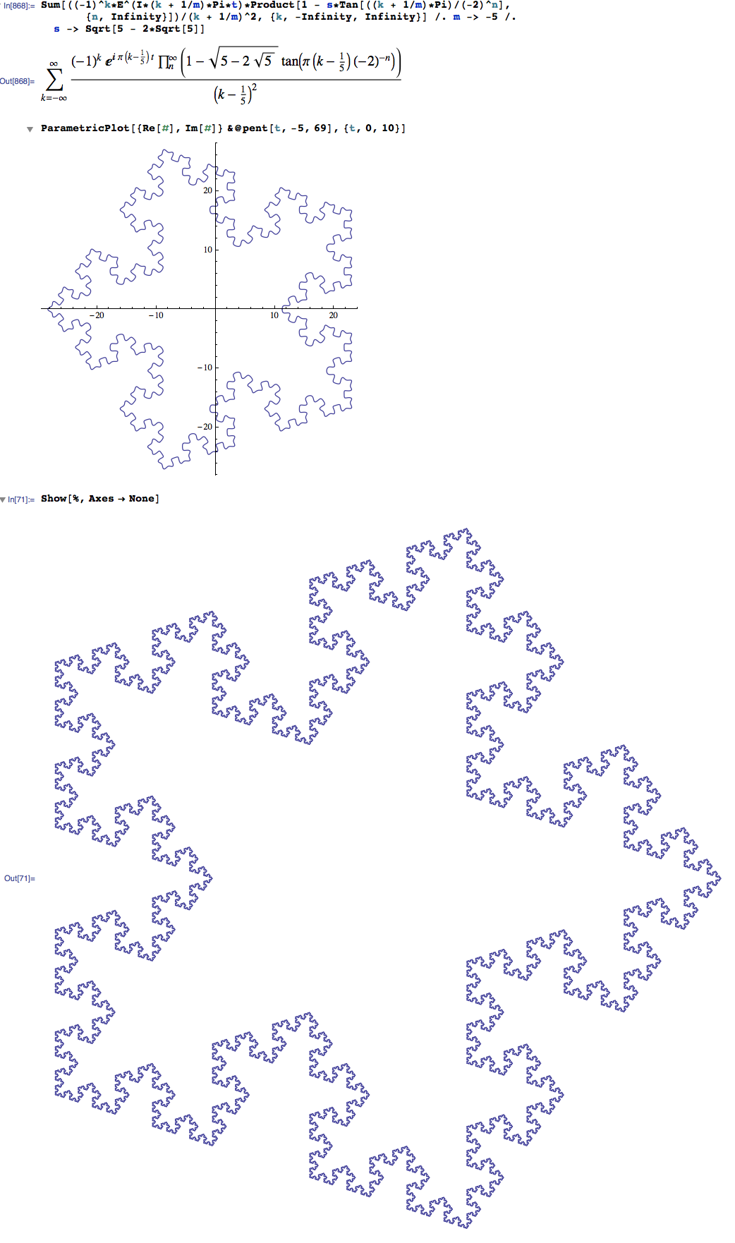 The Fourier series mentioned below is a specialization of the one in gosper.org/fst.pdf, which alternatively specializes to the Koch's Snowflake, Peano's spacefiller, etc., according to the parameter s. For convergence, the geometry of the recursion underlying the construction of the Fourier coefficients requires |s-i| < 2, but at s= √3, the infinite product telescopes, revealing that series convergence also extends to this boundary point. A couple of days ago I thought I noticed convergence beyond |s-i| = 2, but common sense and recent experiments at Julian's house convinced me I was hallucinating. In the process, we produced some pleasantly Picassoid squiggle <http://gosper.org/snowfourier.pdf>s. (Or maybe just Dr. Seuss.) The function futst(t,s,m,cutoff) traces the outline of the curve repeated around a regular m-gon as 0≤t≤2m, low-pass (t=time) filtered to the cutoff frequency (default ±69 harmonics).
