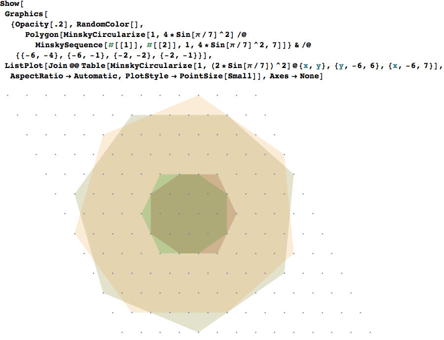 I seriously doubt it. The "triangular lattice" is just a square one skewed by {x,y} → {(x Csc[π/7] - 2 y Sin[π/7])/(Sqrt[2] (-1 + Csc[π/7]^2)^(1/4)), Sqrt[2] y (-1 + Csc[π/7]^2)^(1/4) Sin[π/7]} , (http://www.blurb.com/books/2172660-minskys-trinskys-3rd-edition , p14) which circularizes Minsky ellipses computed by the iteration x[n+1] = x[n] - Floor[4 Sin[π/7]^2 y[n]] ; y[n+1] = y[n] + x[n+1] This recurrence has period 7 for {x0,y0} among ..., {-7, -1}, {-9, -6}, {-11, -5}, {-12, -5}, {-6, -2}, {-6, -1}, {-9, -4}, {-5, -5}, {-5, -3}, {-5, -1}, {-4, -2}, {-9, -2}, {-2, -2}, {-2, -1}, {-8, -7}, {-12, -10}, {-11, -10}, {-10, -9}, ... But, Oh, SHOOT!, had I instead used x[n+1] = x[n] - y[n] ; y[n+1] = y[n] + Floor[4 Sin[π/7]^2 x[n+1]] (not x[n]) the grid becomes nearly equilateral (~ 7:8:8) and the heptagons http://gosper.org/heptagrid.png look regular enough for a 1 April hoax! --rwg