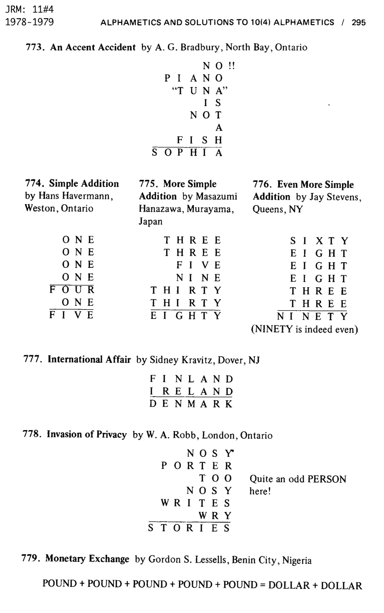 I noticed the failure of my memory reconstruction unit when I came across a Google book reference to my problem in Stanley Rabinowitz and Mark Bowron's Index to Mathematical Problems, 1975-1979, page 258. Presumably to save space, ONE + ONE + ONE + ONE = FOUR + ONE = FIVE is how it is printed in there, but I assure you that is not how I posed the problem, nor is it how the Journal of Recreational Mathematics published it: http://chesswanks.com/pot/alphametic.png On Apr 19, 2013, at 7:41 PM, Fred lunnon <fred.lunnon@gmail.com> wrote: