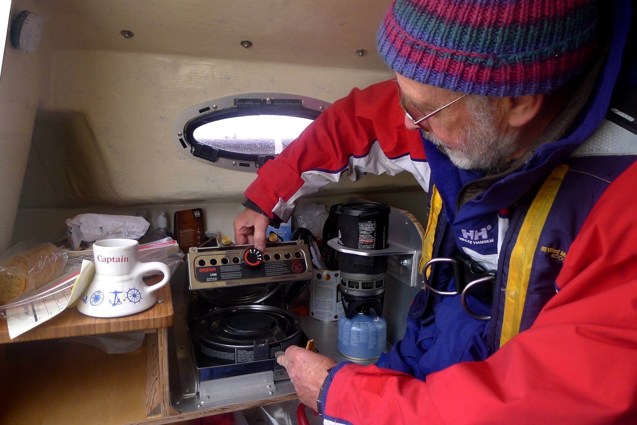 Hi, I haven't forgotten you. My problem is I have to find the photos of the tool box galley before I can send them to you. Basically it is a _*19 inch tool box*_ - without drawers or compartments - the simplest you can find. ( Thought: maybe a tool box with compartments in the top lid might be handy for things like salt / pepper / sugar / dish detergent, though you then loose interior lid volume) I cut a birch plywood cutting board ( 1/4" thick) that fit inside the lip of he bottom of the tool box. I did the same with a piece of clear plastic for the top of the tool box. This is so that I can see what was stored in the top lid ( knives; and various other tools) The bottom of the tool box contained: a S/S salad bowl / plastic soup bowls / pot and frying pan / small Corningware teakettle / square plastic plates / nesting coffee cups from a British Airway flight from Oslo to Berlin; silverware (in a heavy plastic pouch for easy retrieval); large spoon; corkscrew; salt / pepper shakers / sugar container / small dish detergent bottle/ wine glasses. Under the plastic cover in the lid I stored a kitchen knife / paring knife / all held in place with wood blocks and bungee cord. I also made a wood block to fit the tool box handle so that when the galley was open, the top lid rested on the wood block and remained horizontal. Our stove was a square restaurant table-side cooker with a propane bottle. When you turned off the stove the bottle was disconnected from the stove. These are available at restaurant supply houses and cost about $25.- Everything else in the tool box galley came from GOODWILL stores / the Salvation Army store / or what I scrounged at Tag Sales. It becomes a 3D puzzle to make everything fit, but is an enjoyable game when you have a very practical end product that stows easily in an M15. What I listed were "our" galley contents. With these items we were able to make breakfast / lunch/ or dinner, using the filler piece in the cabin as the work surface at the aft end of the cockpit. Our BIMINI provided sun / rain protection for cooking and dining. I also built a small table that filled the companionway; with legs that fit over the lower hatch board to hold it in place; and that folded flat for storage. Great for cocktail hour in a secluded cove with the anchor down. Also great for longer car trips where we would stop at an Interstate rest stop; take out the tool-box galley; put our table cloth over the picnic table and then dine. It was also useful in hotel / motel rooms where you could make your own breakfast. Yours will probably vary depending on how much cooking you plan to do on board / and what your food preferences might be Photos follow. Connie