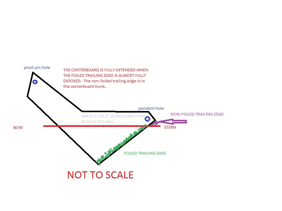 George: attached is a simplified diagram showing how the centerboard is sitting when extended. the centerboard on the M15 will not come fully out as the forward edge of the board hits the forward end of the trunk. you don't want to sail the boat with the board hitting the forward end of the trunk. always support the board by the pennant.