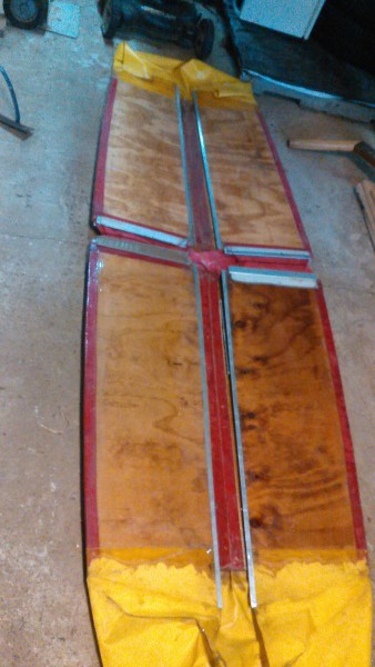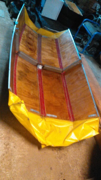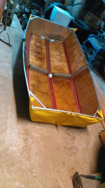 I've been working on this project for awhile and I thought I'd showoff with a few pictures. Basically it is a folding dinghy that folds down to 46" long and about 8" thick that fits across the transom of the M15. Takes about 5 minutes to assemble and faster to take down, but I'm working to try and improve that.
