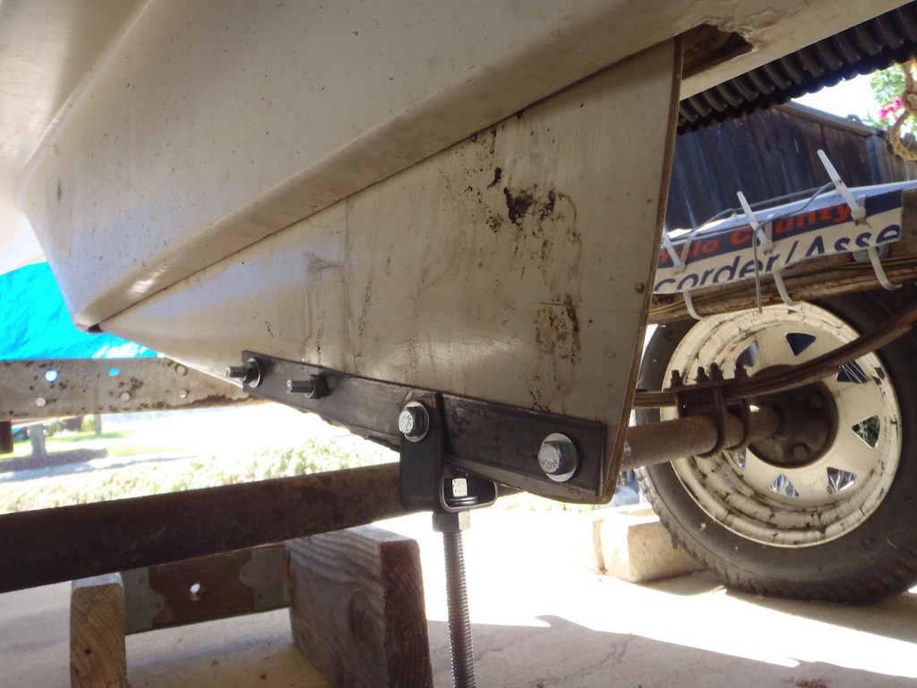 On my M15 I tried hammering a rod down from the top, and it caused a lot of damage to the inside of the centerboard trunk that took a lot of work to fix once I got the keel down, but it didn't move the centerboard at all. I would really strongly recommend against continuing with that course of action. What worked for me was building a puller and pulling down from the bottom, per a design posted by Captain Jim Sadler on this board. I am attaching the photos of the puller I made with just a dremel and standard hardware store parts. Sincerely, Tyler ----- Original Message ----- From: "James Hymes" <jamesehymes@gmail.com> To: "For and about Montgomery Sailboats" <montgomery_boats@mailman.xmission.com> Sent: Monday, March 4, 2019 2:12:02 PM Subject: M_Boats: Possible solution for stuck centerboard My CB has been stuck the past several times I've taken her (#69 M17(Not Coyote- I believe the boat named Coyote has the same number as mine, but was modified for racing - doesn't have a full cabin--but that 's not important right now). anyways, I drilled a 3/4" hole in the cockpit floor just aft of the doorway into the cabin above the CB . Drilled it there so that the steel rod will have good contact with the top of the stuck CB. I used a steel rod and a 10 lb sledgehammer, floated the boat but kept it on the trailer at the boat ramp. I was able to lower the CB a little, didn't have the motor so didn't want to have to struggle getting the boat back on the trailer in the wind - since it was not in open water I didn't get to see if it would drop all the way, will find that out next time. The last time I did sail with the CB up, it was too windy, and I was uncomfortable with the amount of heeling it did and also didnt point so well. I'm extremely hopefull the CB will drop all the way, cause if not I'll take ti and lift the boat on land and try wiggling the CB out while hitting it from above, may have to get drastic and cut open the keel and dig out the old steel slugs and replace with lead ballast - something I hope to avoid. If it works out, I'll put in some sort of plastic with a removable cap for the steel rod to fit into. I'll repost to let ya'll know if the sledge works. Jim in Denton Texas
