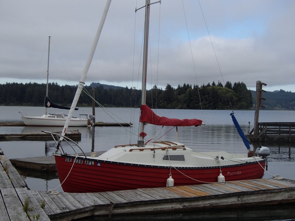 Here's a couple shots of 'Pajarita' at her rustic berth at Westlake resort on Siltcoos lake (different days, different weather). I had her in the lake for a month, give or take a day, late July to late August. Mostly it's calm overnight and mornings and wind comes up starting about 10-10:30 am, pushing in from the coast just a few miles away. Within 1 1/2-2 hours it is up to full force for the day, which in summer is often upper teens in knots and more on 'windy' days (when there are small craft warnings offshore). A forecast under mid-teens is considered a mellow day in that area... Prevailing winds are from the N to NW. There were a few days with different conditions, one with wind from the S to SW which was swirlier because there are more hills in that direction vs. flatter land to the N to NW. So there's a window of somewhat mellow sailing for a bit starting mid-morning and then it gets to be good practice conditions for high & generally gusty lake winds. The wind is smoother on the far (SE, from the marina) side of the lake. It is strongest and gustiest in the W-NW corner, including Westlake/Dunes City, where the marina is. In particular the approach to the marina is normally upwind and more intense (stronger, gustier) the closer you get. If you look it up on a map you can see Jernigan island that creates a pinched area for some extra swirl and gustiness heading towards the marina. Most of the time I left the first reef in my main, as I knew I'd have to reef soon after setting out anyhow. I just put the full jib out to start, if I was out early enough, and then reefed it in progressively as the wind picked up. Definitely a nice lake to sail on if you're within hauling distance & don't mind strong winds most of the time. Westlake resort is quiet & funky, the owner Brandon & his family & sister-in-law etc. run the place,all very nice people. County park boat ramp is directly adjacent to their little marina. cheers, John -- John Schinnerer - M.A., Whole Systems Design -------------------------------------------- - Eco-Living - Whole Systems Design Services People - Place - Learning - Integration john@eco-living.net - 510.982.1334 http://eco-living.net http://sociocracyconsulting.com
