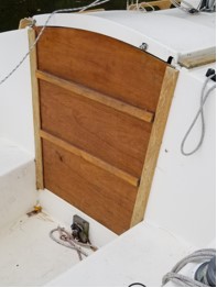 I just made a set for Monita last winter using a face layer of luan and a back layer of birch plywood. (I like the look of the luan/mahogany grain better than the birch.) I epoxied all sides, varnished the fronts and painted the backs white. This keeps the kids from trying to put them in backwards! A teak louvered insert from Amazon adds ventilation. The edges that slide in the channels have an extra layer of epoxy with graphite powder as a wear layer and to help them in more easily.
