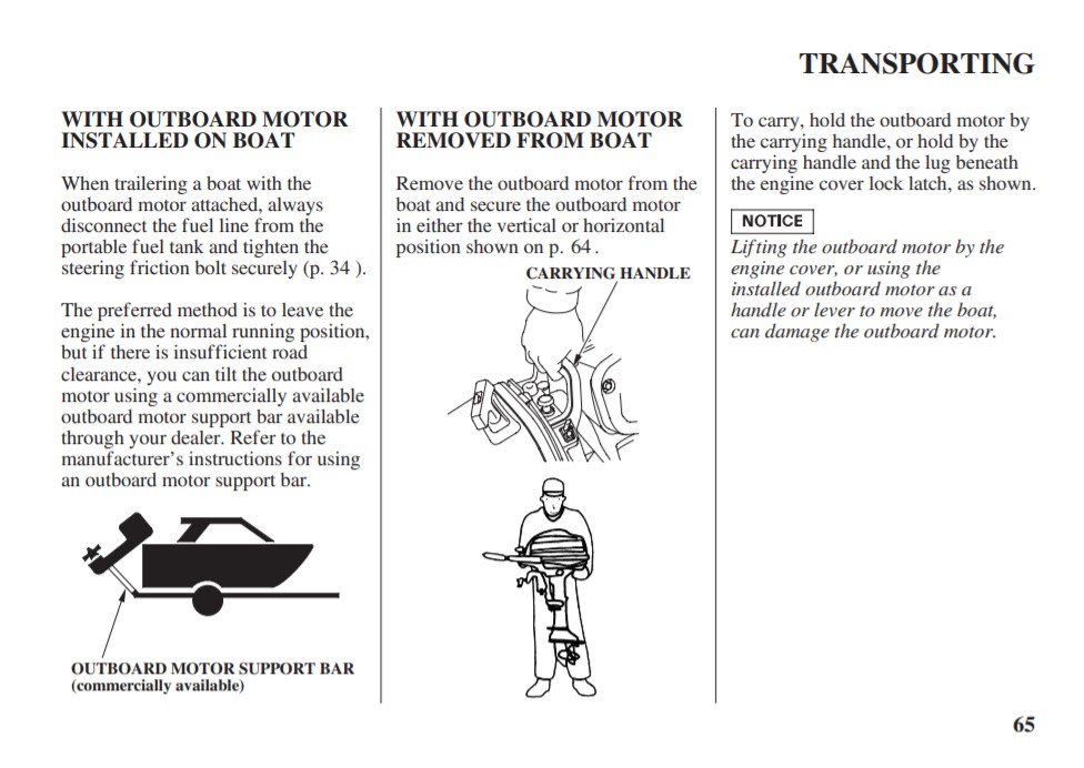Gail: as Thomas wrote the motor shouldn't be on the transom & that the motor needs to be secured and wrapped for leak containment in cabin. the rudder is a question as if it is a RudderCraft type with the integrated mast support things will have to be different. (as I wrote before what rudder does the boat have?) i disagree with Thomas on the orientation of the motor - each motor is different. read the manual and follow it EXACTLY. for example - the Hondas are THROTTLE LEVER UP! throttle lever down will result in motor damage as the oil will run into the cylinder head and other places. PLEASE see attached image showing manual page from Honda 5 manual! what brand & model motor does the boat have? :: Dave Scobie :: SV SWALLOW - https://sv-swallow.com :: Montgomery 6'8" #650 :: Truck camper - https://truckpopupcamper.wordpress.com/ :: Ramblings - https://scoobsramblings.wordpress.com/ :: former M17 owner #375 SWEET PEA - https://m17-375.com/ <http://www.m17-375.webs.com/> :: former M15 owner #288 - http://www.freewebs.com/m15-name-scred On Tue, Feb 2, 2021 at 11:37 AM Thomas Buzzi <thomaspbuzzi@gmail.com> wrote: