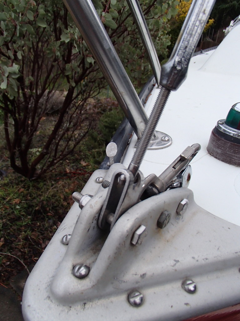 Ok, last night I was able to compare the masts side by side and take measurements. I will be able to use a tabernacle with no problem. I'll return the hinged base. Oh while I'm on rigging, can someone confirm if this is an original bow plate from the mid 70's? Someone expressed concern that it wasn't, or was not in the right spot, or might pull the bolts through the deck. There isn't a backing plate, the bolts just go through the deck. I see no signs of modification in this area though.