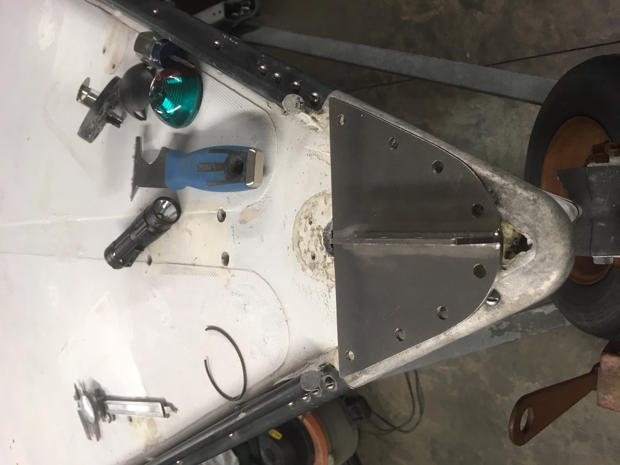 That is not the original bow plate. I don't have a photo right now, but the original is a handsome aluminum casting that wraps around the bow's tip and under the hull-deck joint. It provides much needed strength and protection in an area that is handling a good amount of tension from the forestay and is very exposed to collision damage. Hard to imagine the thought process that led to its removal from your boat. In my opinion, if you stay with what you have, you definitely need to reinforce the deck underneath. -----Original Message----- From: montgomery_boats <montgomery_boats-bounces@mailman.xmission.com> On Behalf Of Gerry Lempicki via montgomery_boats Sent: Saturday, May 4, 2019 3:51 AM To: Msog <montgomery_boats@mailman.xmission.com> Subject: M_Boats: M17 rigging continued Ok, last night I was able to compare the masts side by side and take measurements. I will be able to use a tabernacle with no problem. I'll return the hinged base. Oh while I'm on rigging, can someone confirm if this is an original bow plate from the mid 70's? Someone expressed concern that it wasn't, or was not in the right spot, or might pull the bolts through the deck. There isn't a backing plate, the bolts just go through the deck. I see no signs of modification in this area though.