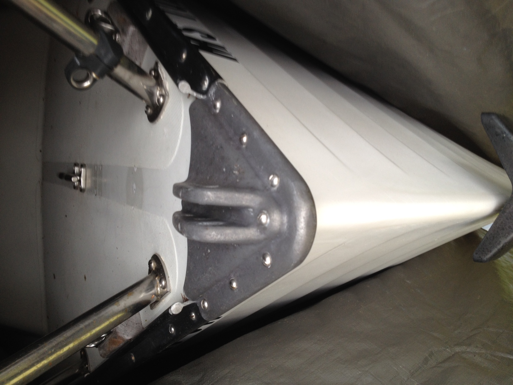 I am now the owner of the 2010 M17 “Grace” (now “Poppy”) in the video. While de-rigging after the Lake Pleasant Messabout, Jerry commented that he’d done a number of repairs on this bow plate and strongly recommended I order a replacement from Sage. ($100 + shipping) I ordered the replacement item. Triangular in shape, this stainless plate has four bolts on each side that through-bolt the much-thicker hull/deck joint. This plate is flat, so after applying bedding, the bolts must be gradually tightened to pull it to the slight curvature of the deck. Works great. Looks great. I left the old plate in place for attaching a jackline, etc. Note... It will add approx 1” to the needed length of your forestay, so you’ll either need to add an extension toggle or have a new forestay built. Les