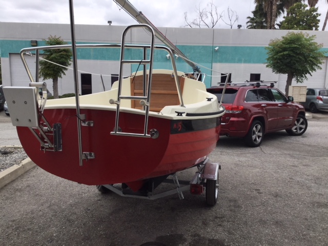 My boarding ladder consists of 2 lengths of stout Iine and a board with holes drilled in each end. The lines are knotted and passed thru the holes on one end, and then passed thru the holes in the aluminum extrusion that runs around the edge of the deck. I deploy it at the aft corner of the cockpit. I can reach up and grab it from the water. The board floats and you have to push it down and insert your foot between the board and hull. It can be removed easily, requires no drilling. The backstay interferes with using a transom mounted ladder on a M17. No Cost? Nothing. Boarding ladder and motor mount hanging off the back of that lovely transom? I don't think so. Whatever boarding device you decide on be sure to practice with it repeatedly, especially when tired. You may need to get back aboard was someday when your life depends on it. It can be seen in this photo in the stowed position.
