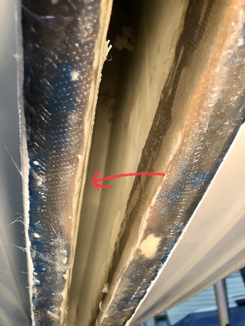 1. Let’s assume water got in recently and thru one of two ways. A. The pin Boss is solid glass, and completely isolated from the water except for the ends (both sides) and held in place with caulking. It slides with force using a punch. If the crew damaged the pin boss by pounding, drilling or hammering the pin area they might have breached the watertight integrity and after looking around hastily decided to FIBERGLASS THE Pin in place. I assume they didn’t use caulk and hammering the pin sideways decided to place a square of glass over the ends to keep it in.