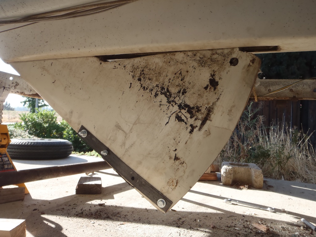That said, I used 2x6 boards and pushed right at a strong "wrinkle" in the hull. I think the force was very spread out and not a problem for the very stiff and thick M15 hull. There was no visible flexing or deformation of the hull at all. Honestly, I didn't need to apply much force to get the board down. I think the main problem I had before was that I couldn't get steady force in the correct direction, so nothing would make it move. The old centerboard was extremely brittle and would chip and fall apart whenever I tried to pry on it or grip it until I sandwiched it between those two heavy steel plates.