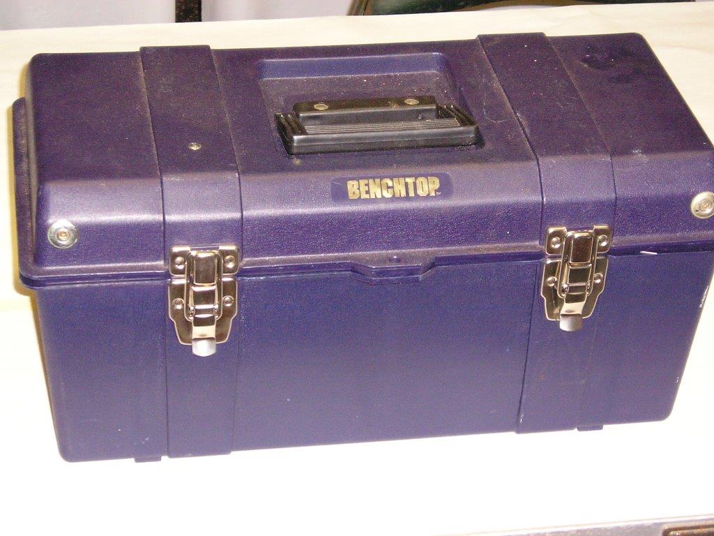The tool box was 19" long , _*with a lift out tray, that you discard*_. Look for the el-cheapo ones at HOME DEPOT or LOWES. You don't want boxes with attached drawers that expand as you open the box; or with containers for screws in the top lid. Your objective is to be able to use the whole volume in the lid for knives and other bits and pieces.