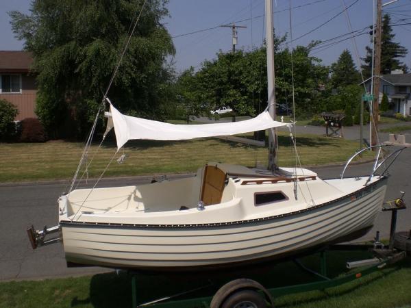 I had the sailmaker make up a 7X7 tarp of acrylan with a grommet in each corner, then used two whisker poles to go in front and back, and a line off each corner. it can be set up with the poles either over or under the boom, and can easily be canted either way to dodge the sun by adjusting the corner lines, which go down to the rails. I learned this from some of my cruising buddies in Tucson, who sail in Mexico. Even more proof that I know how to listen, despite what some say. A 6X6 tarp works well on the 15. When sailing I roll everything up together and lash it to the toe rail.