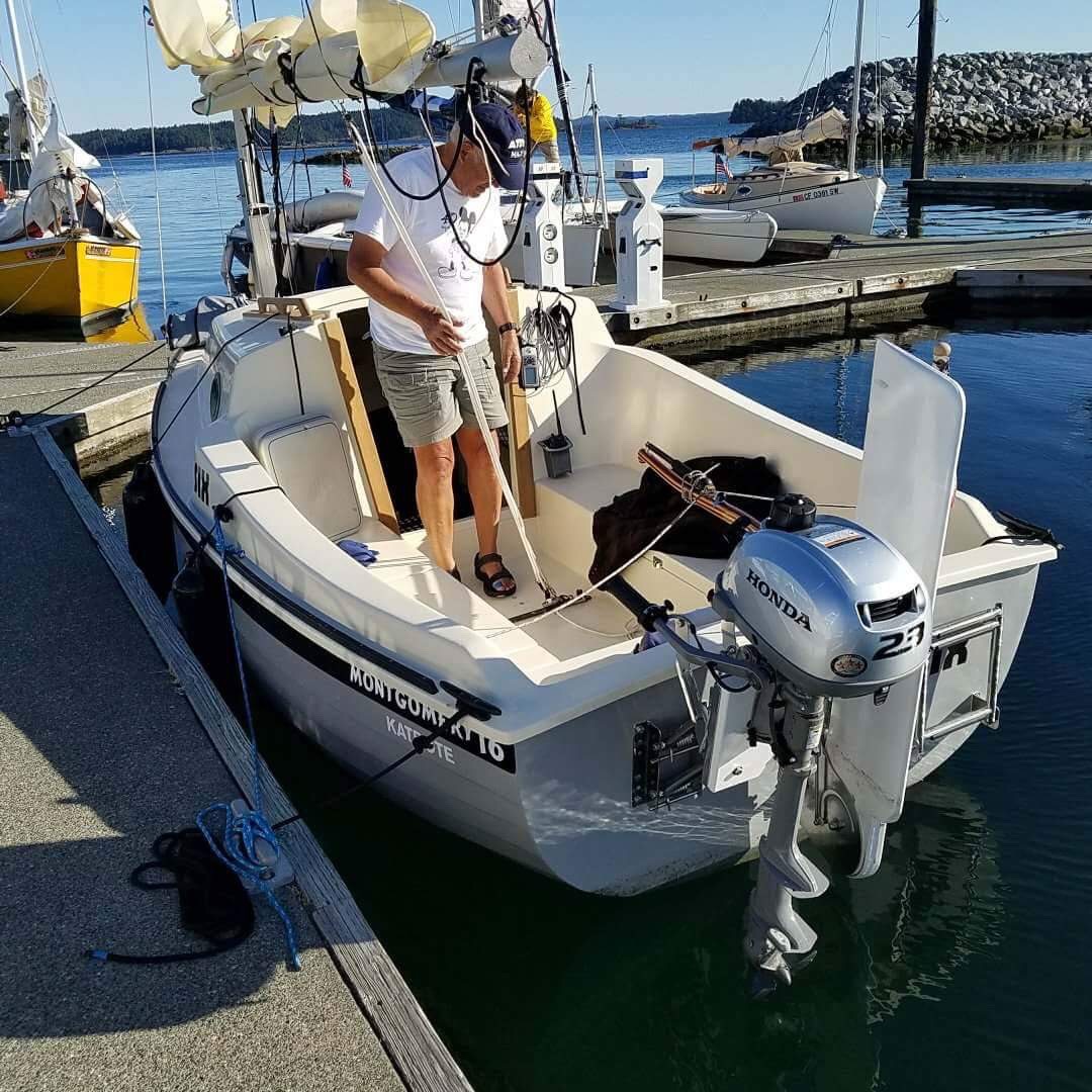 The boom can be lowered 12 inches. The boom is sliding We're going to increase the Main by adding 12 inches to the bottom. We only test sailed her the night before Dan pulled her to Bellingham Washington for The 15th annual mess about. He likes that he can stand up. The 16 KatBote was the fastest boat in the fleet except for Judys trimaran.