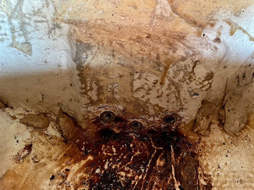 I removed the bottom rudder pivot bracket to find that silicon was used to bed these bolts and water has likely been seeping in for a long time. The wood in there is now essentially earth.